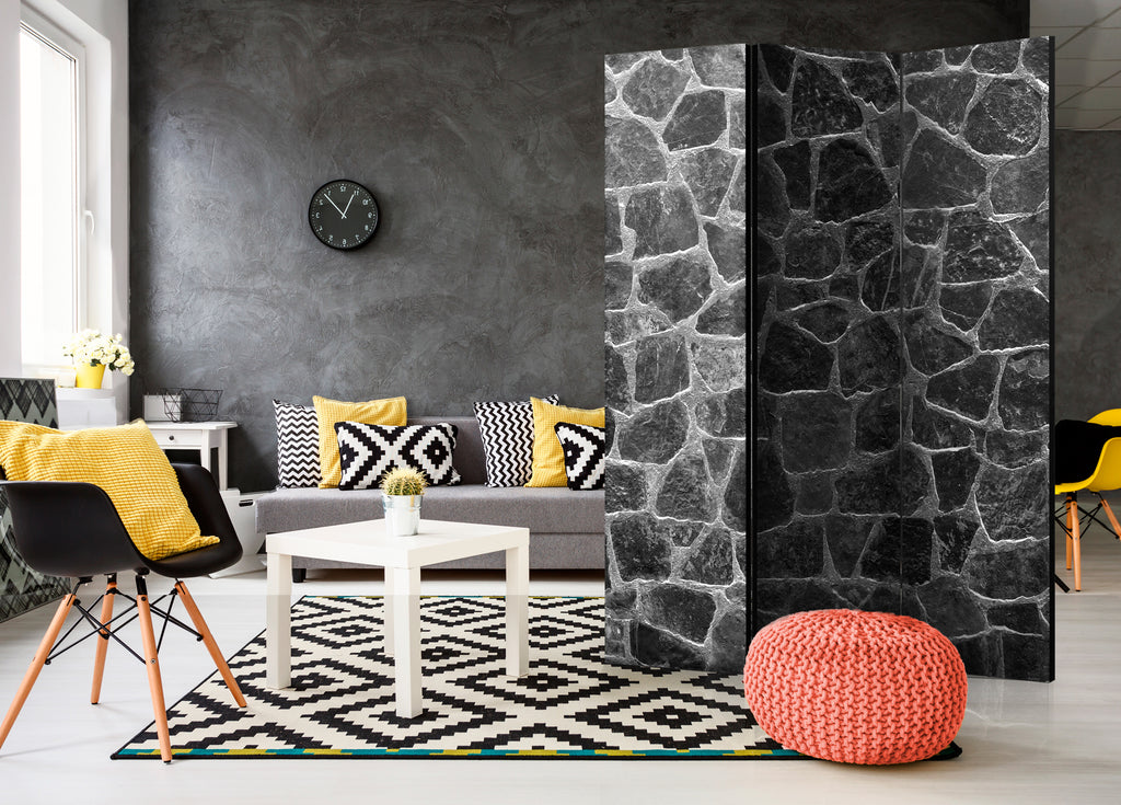 Het decoratieve vouwscherm "Vouwscherm - Black Stones [Room Dividers]" past uitzonderlijk mooi in een modern interieur. Het houten driedelige en tweezijdig bedrukte vouwscherm geeft niet alleen een mooie opdeling van een ruimte maar geeft ook een fantastische flair aan uw interieur. De perfectie uitvoering en het originele motief in full HD uitvoering zorgen ervoor dat de kamervouwschermen iedere ruimte een originele charme verschaffen. Een prachtig kamervouwscherm is een zeer originele versiering en kan bijvoorbeeld prima worden toegepast in woningen of dienstruimten. (kapsalon, dokterskliniek, administratiekantoor etc)