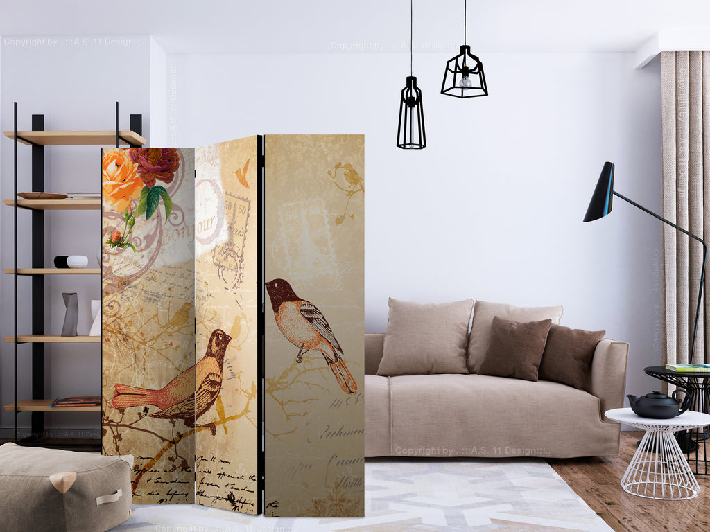 Het decoratieve vouwscherm "Vouwscherm - Bonjour [Room Dividers]" past uitzonderlijk mooi in een modern interieur. Het houten driedelige en tweezijdig bedrukte vouwscherm geeft niet alleen een mooie opdeling van een ruimte maar geeft ook een fantastische flair aan uw interieur. De perfectie uitvoering en het originele motief in full HD uitvoering zorgen ervoor dat de kamervouwschermen iedere ruimte een originele charme verschaffen. Een prachtig kamervouwscherm is een zeer originele versiering en kan bijvoorbeeld prima worden toegepast in woningen of dienstruimten. (kapsalon, dokterskliniek, administratiekantoor etc)