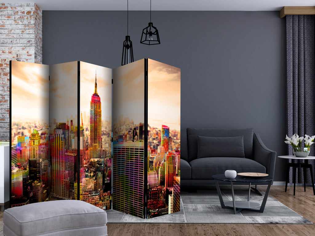 Het decoratieve vouwscherm "Vouwscherm - Colors of New York City III II [Room Dividers]" past uitzonderlijk mooi in een modern interieur. Het houten tweezijdig bedrukte vouwscherm geeft niet alleen een mooie opdeling van een ruimte maar geeft ook een fantastische flair aan uw interieur. De perfectie uitvoering en het originele motief in full HD uitvoering zorgen ervoor dat de kamervouwschermen iedere ruimte een originele charme verschaffen. Een prachtig kamervouwscherm is een zeer originele versiering en kan bijvoorbeeld prima worden toegepast in woningen of dienstruimten. (kapsalon, dokterskliniek, administratiekantoor etc)