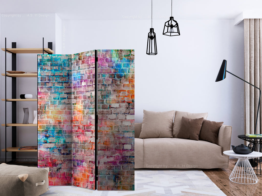 Het decoratieve vouwscherm "Vouwscherm - Colourful Brick [Room Dividers]" past uitzonderlijk mooi in een modern interieur. Het houten driedelige en tweezijdig bedrukte vouwscherm geeft niet alleen een mooie opdeling van een ruimte maar geeft ook een fantastische flair aan uw interieur. De perfectie uitvoering en het originele motief in full HD uitvoering zorgen ervoor dat de kamervouwschermen iedere ruimte een originele charme verschaffen. Een prachtig kamervouwscherm is een zeer originele versiering en kan bijvoorbeeld prima worden toegepast in woningen of dienstruimten. (kapsalon, dokterskliniek, administratiekantoor etc)