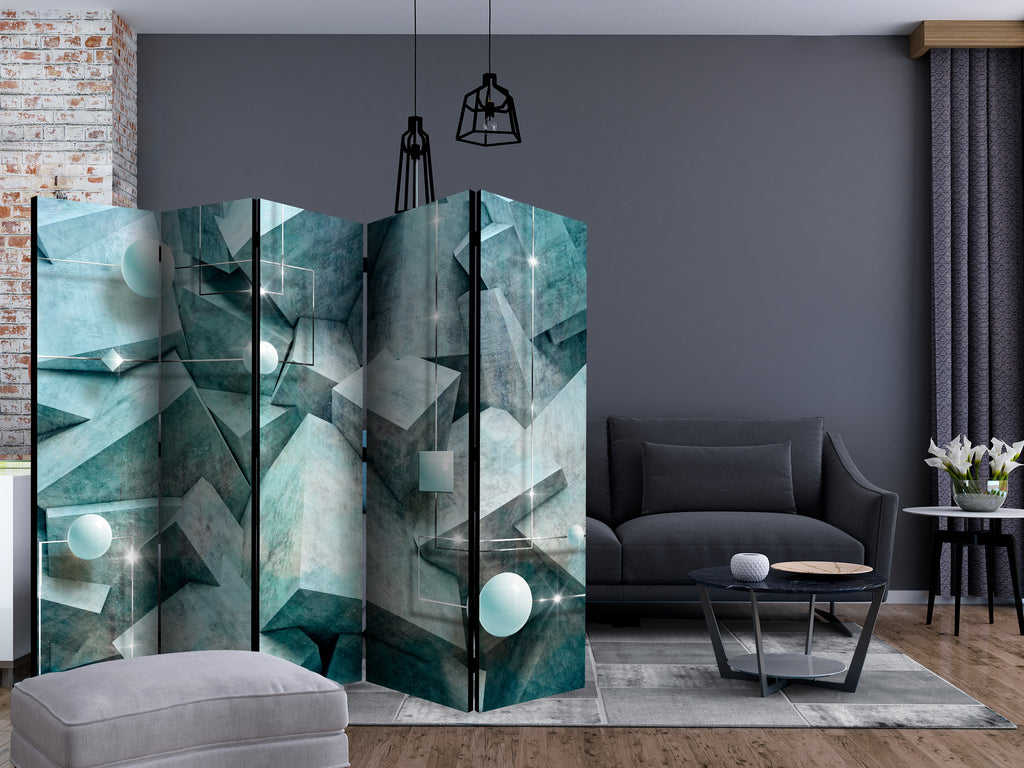 Het decoratieve vouwscherm "Vouwscherm - Concrete Cubes (Green) II [Room Dividers]" past uitzonderlijk mooi in een modern interieur. Het houten tweezijdig bedrukte vouwscherm geeft niet alleen een mooie opdeling van een ruimte maar geeft ook een fantastische flair aan uw interieur. De perfectie uitvoering en het originele motief in full HD uitvoering zorgen ervoor dat de kamervouwschermen iedere ruimte een originele charme verschaffen. Een prachtig kamervouwscherm is een zeer originele versiering en kan bijvoorbeeld prima worden toegepast in woningen of dienstruimten. (kapsalon, dokterskliniek, administratiekantoor etc)