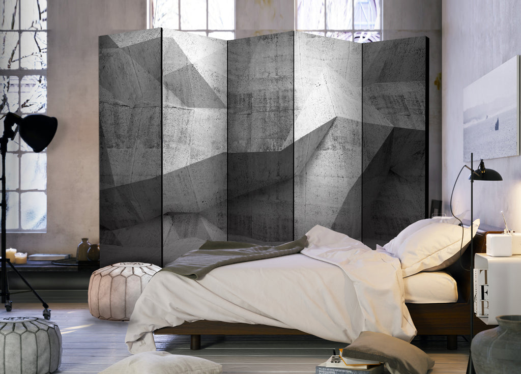 Het decoratieve vouwscherm "Vouwscherm - Concrete Geometry II [Room Dividers]" past uitzonderlijk mooi in een modern interieur. Het houten tweezijdig bedrukte vouwscherm geeft niet alleen een mooie opdeling van een ruimte maar geeft ook een fantastische flair aan uw interieur. De perfectie uitvoering en het originele motief in full HD uitvoering zorgen ervoor dat de kamervouwschermen iedere ruimte een originele charme verschaffen. Een prachtig kamervouwscherm is een zeer originele versiering en kan bijvoorbeeld prima worden toegepast in woningen of dienstruimten. (kapsalon, dokterskliniek, administratiekantoor etc)
