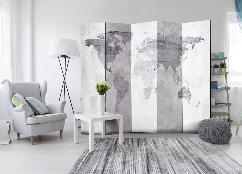 Het decoratieve vouwscherm "Vouwscherm - Concrete Map [Room Dividers]" past uitzonderlijk mooi in een modern interieur. Het houten tweezijdig bedrukte vouwscherm geeft niet alleen een mooie opdeling van een ruimte maar geeft ook een fantastische flair aan uw interieur. De perfectie uitvoering en het originele motief in full HD uitvoering zorgen ervoor dat de kamervouwschermen iedere ruimte een originele charme verschaffen. Een prachtig kamervouwscherm is een zeer originele versiering en kan bijvoorbeeld prima worden toegepast in woningen of dienstruimten. (kapsalon, dokterskliniek, administratiekantoor etc)