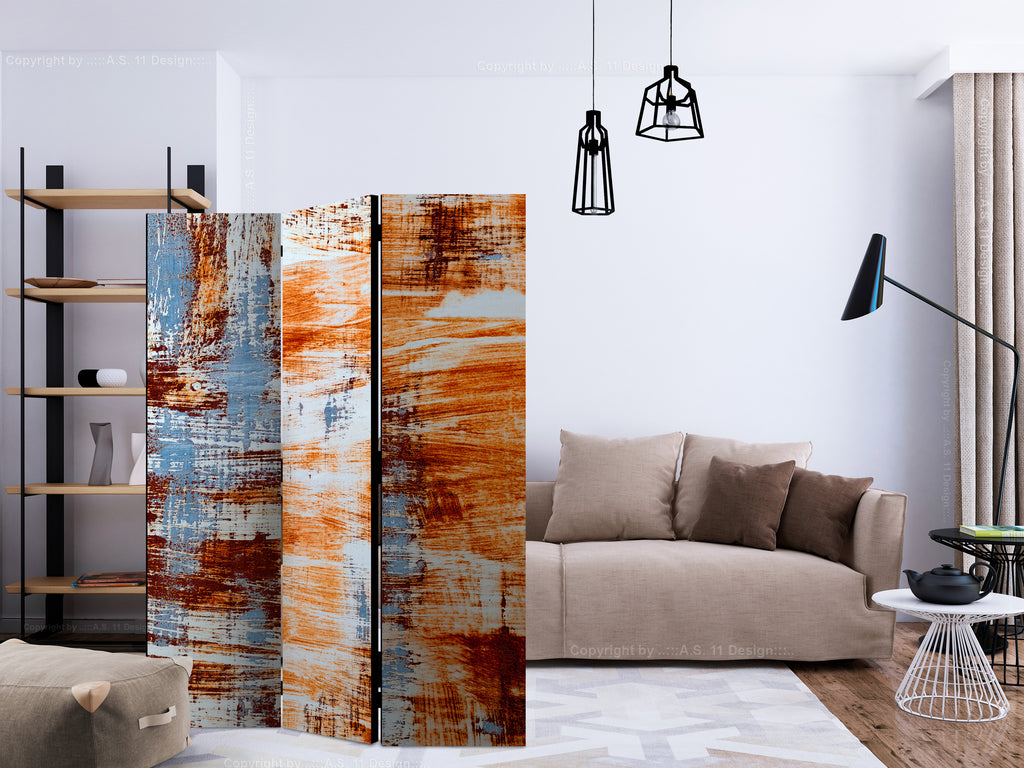 Het decoratieve vouwscherm "Vouwscherm - Corrosion [Room Dividers]" past uitzonderlijk mooi in een modern interieur. Het houten driedelige en tweezijdig bedrukte vouwscherm geeft niet alleen een mooie opdeling van een ruimte maar geeft ook een fantastische flair aan uw interieur. De perfectie uitvoering en het originele motief in full HD uitvoering zorgen ervoor dat de kamervouwschermen iedere ruimte een originele charme verschaffen. Een prachtig kamervouwscherm is een zeer originele versiering en kan bijvoorbeeld prima worden toegepast in woningen of dienstruimten. (kapsalon, dokterskliniek, administratiekantoor etc)