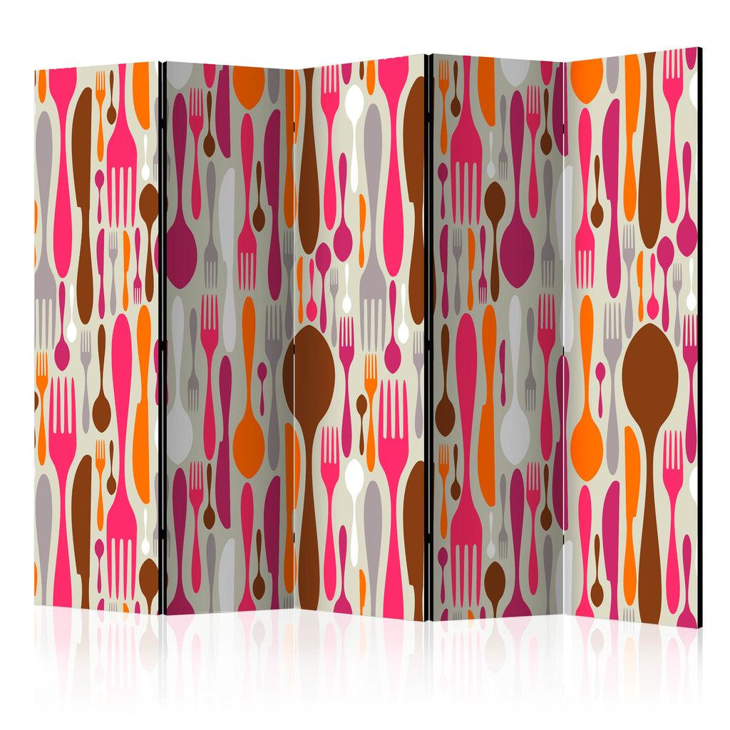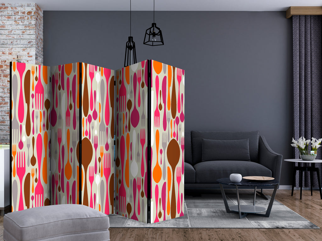 Het decoratieve vouwscherm "Vouwscherm - Cutlery - pink and violet II [Room Dividers]" past uitzonderlijk mooi in een modern interieur. Het houten tweezijdig bedrukte vouwscherm geeft niet alleen een mooie opdeling van een ruimte maar geeft ook een fantastische flair aan uw interieur. De perfectie uitvoering en het originele motief in full HD uitvoering zorgen ervoor dat de kamervouwschermen iedere ruimte een originele charme verschaffen. Een prachtig kamervouwscherm is een zeer originele versiering en kan bijvoorbeeld prima worden toegepast in woningen of dienstruimten. (kapsalon, dokterskliniek, administratiekantoor etc)