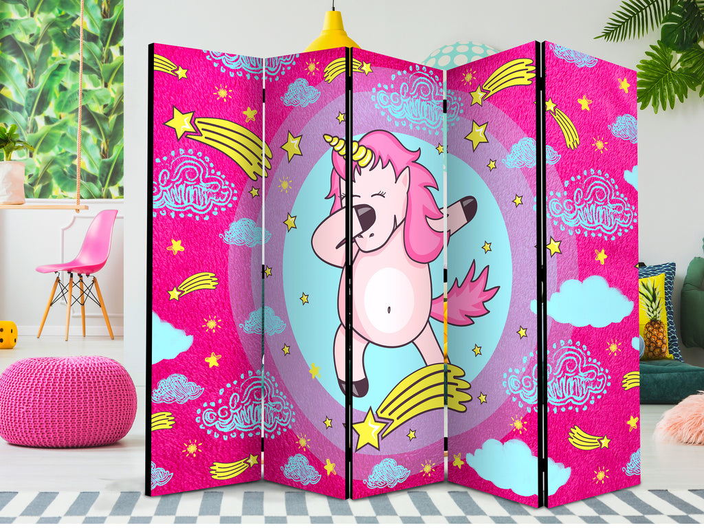 Het decoratieve vouwscherm "Vouwscherm - Dancing Unicorn II [Room Dividers]" past uitzonderlijk mooi in een modern interieur. Het houten tweezijdig bedrukte vouwscherm geeft niet alleen een mooie opdeling van een ruimte maar geeft ook een fantastische flair aan uw interieur. De perfectie uitvoering en het originele motief in full HD uitvoering zorgen ervoor dat de kamervouwschermen iedere ruimte een originele charme verschaffen. Een prachtig kamervouwscherm is een zeer originele versiering en kan bijvoorbeeld prima worden toegepast in woningen of dienstruimten. (kapsalon, dokterskliniek, administratiekantoor etc)