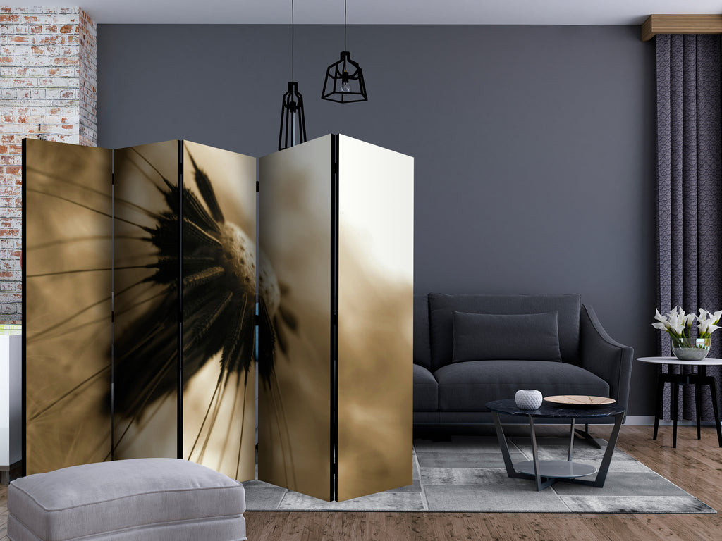 Het decoratieve vouwscherm "Vouwscherm - dandelion - sepia II [Room Dividers]" past uitzonderlijk mooi in een modern interieur. Het houten tweezijdig bedrukte vouwscherm geeft niet alleen een mooie opdeling van een ruimte maar geeft ook een fantastische flair aan uw interieur. De perfectie uitvoering en het originele motief in full HD uitvoering zorgen ervoor dat de kamervouwschermen iedere ruimte een originele charme verschaffen. Een prachtig kamervouwscherm is een zeer originele versiering en kan bijvoorbeeld prima worden toegepast in woningen of dienstruimten. (kapsalon, dokterskliniek, administratiekantoor etc)