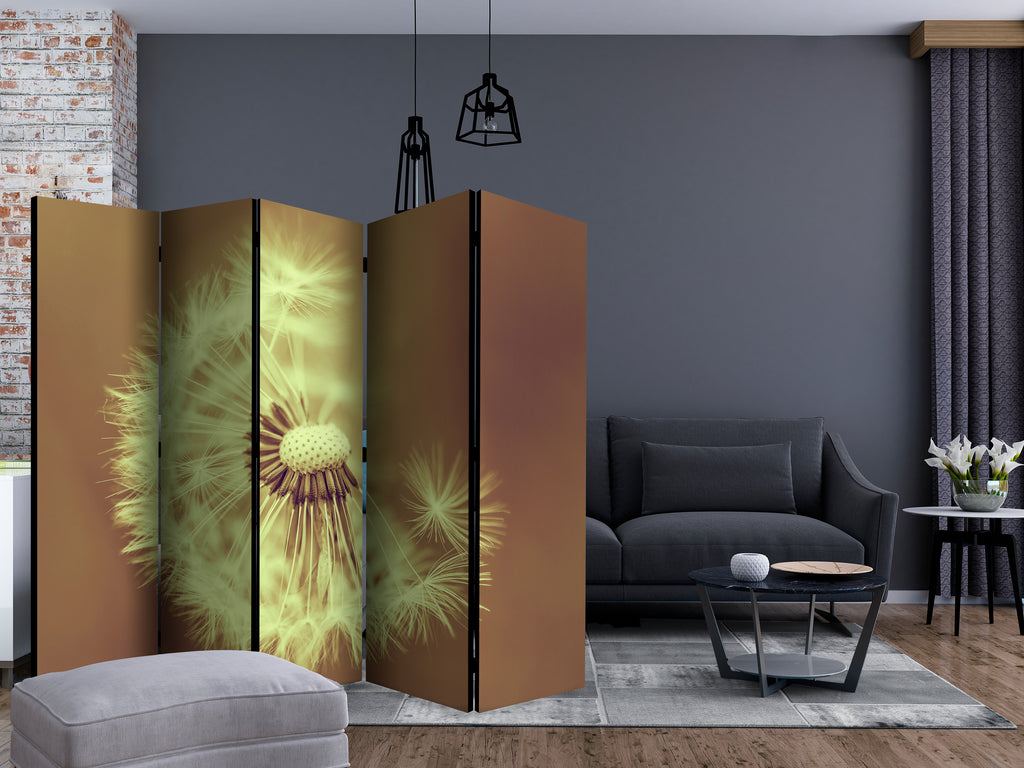 Het decoratieve vouwscherm "Vouwscherm - dandelion (sepia) II [Room Dividers]" past uitzonderlijk mooi in een modern interieur. Het houten tweezijdig bedrukte vouwscherm geeft niet alleen een mooie opdeling van een ruimte maar geeft ook een fantastische flair aan uw interieur. De perfectie uitvoering en het originele motief in full HD uitvoering zorgen ervoor dat de kamervouwschermen iedere ruimte een originele charme verschaffen. Een prachtig kamervouwscherm is een zeer originele versiering en kan bijvoorbeeld prima worden toegepast in woningen of dienstruimten. (kapsalon, dokterskliniek, administratiekantoor etc)