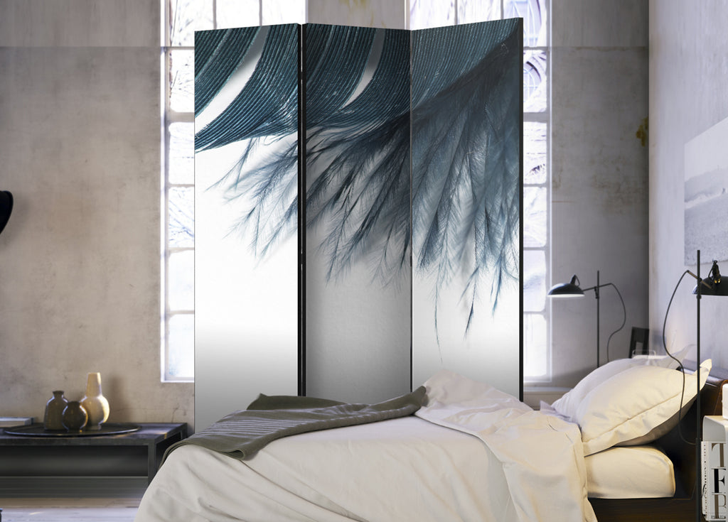 Het decoratieve vouwscherm "Vouwscherm - Dark Blue Feather [Room Dividers]" past uitzonderlijk mooi in een modern interieur. Het houten driedelige en tweezijdig bedrukte vouwscherm geeft niet alleen een mooie opdeling van een ruimte maar geeft ook een fantastische flair aan uw interieur. De perfectie uitvoering en het originele motief in full HD uitvoering zorgen ervoor dat de kamervouwschermen iedere ruimte een originele charme verschaffen. Een prachtig kamervouwscherm is een zeer originele versiering en kan bijvoorbeeld prima worden toegepast in woningen of dienstruimten. (kapsalon, dokterskliniek, administratiekantoor etc)