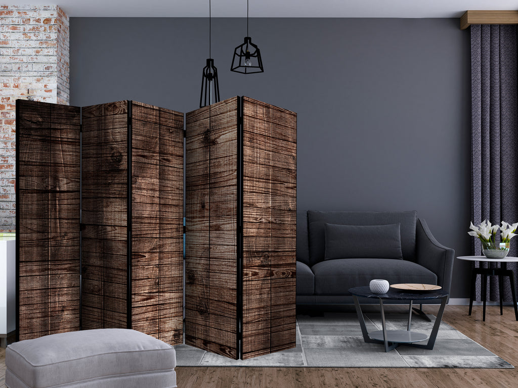 Het decoratieve vouwscherm "Vouwscherm - Dark Brown Boards II [Room Dividers]" past uitzonderlijk mooi in een modern interieur. Het houten tweezijdig bedrukte vouwscherm geeft niet alleen een mooie opdeling van een ruimte maar geeft ook een fantastische flair aan uw interieur. De perfectie uitvoering en het originele motief in full HD uitvoering zorgen ervoor dat de kamervouwschermen iedere ruimte een originele charme verschaffen. Een prachtig kamervouwscherm is een zeer originele versiering en kan bijvoorbeeld prima worden toegepast in woningen of dienstruimten. (kapsalon, dokterskliniek, administratiekantoor etc)