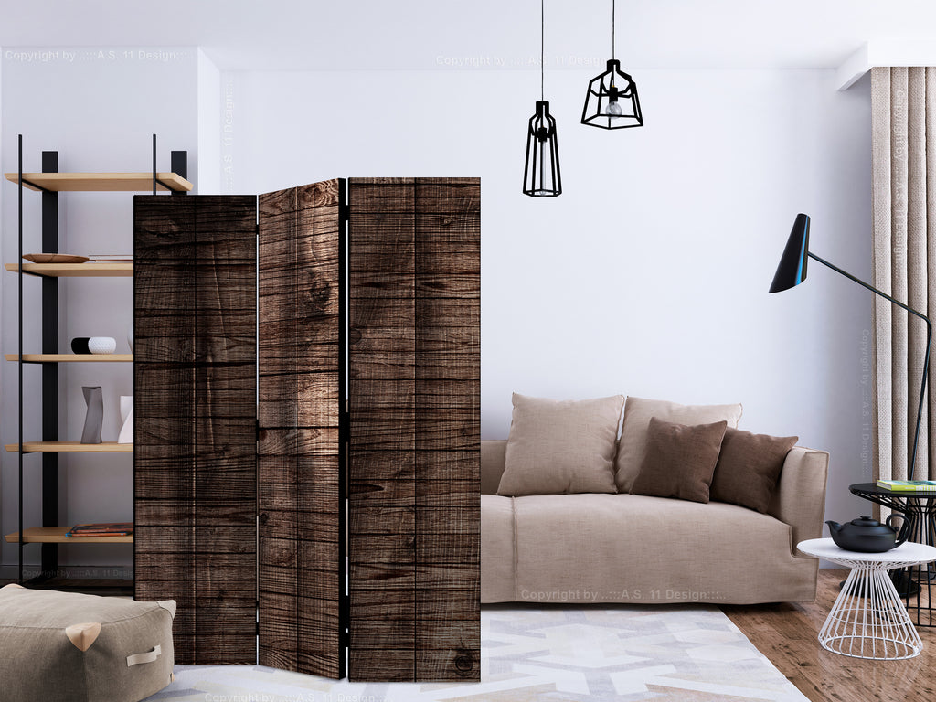 Het decoratieve vouwscherm "Vouwscherm - Dark Brown Boards [Room Dividers]" past uitzonderlijk mooi in een modern interieur. Het houten driedelige en tweezijdig bedrukte vouwscherm geeft niet alleen een mooie opdeling van een ruimte maar geeft ook een fantastische flair aan uw interieur. De perfectie uitvoering en het originele motief in full HD uitvoering zorgen ervoor dat de kamervouwschermen iedere ruimte een originele charme verschaffen. Een prachtig kamervouwscherm is een zeer originele versiering en kan bijvoorbeeld prima worden toegepast in woningen of dienstruimten. (kapsalon, dokterskliniek, administratiekantoor etc)