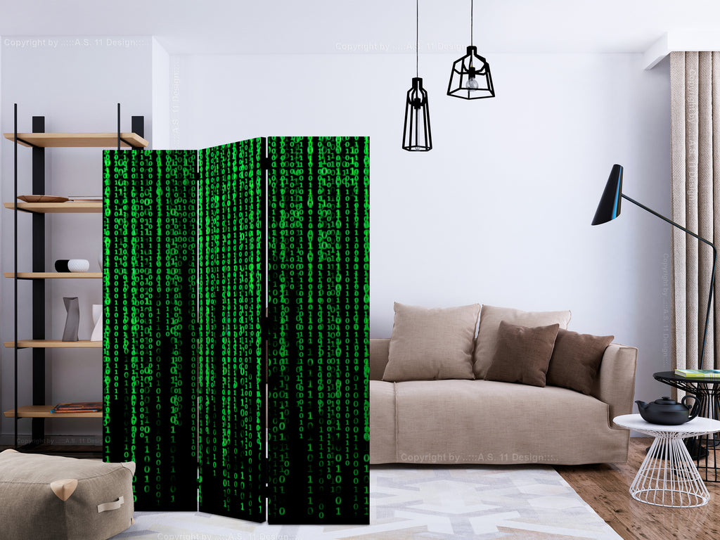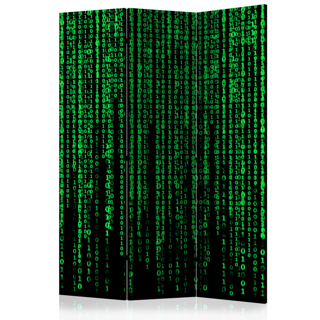 Het decoratieve vouwscherm "Vouwscherm - Digital Rain [Room Dividers]" past uitzonderlijk mooi in een modern interieur. Het houten driedelige en tweezijdig bedrukte vouwscherm geeft niet alleen een mooie opdeling van een ruimte maar geeft ook een fantastische flair aan uw interieur. De perfectie uitvoering en het originele motief in full HD uitvoering zorgen ervoor dat de kamervouwschermen iedere ruimte een originele charme verschaffen. Een prachtig kamervouwscherm is een zeer originele versiering en kan bijvoorbeeld prima worden toegepast in woningen of dienstruimten. (kapsalon, dokterskliniek, administratiekantoor etc)