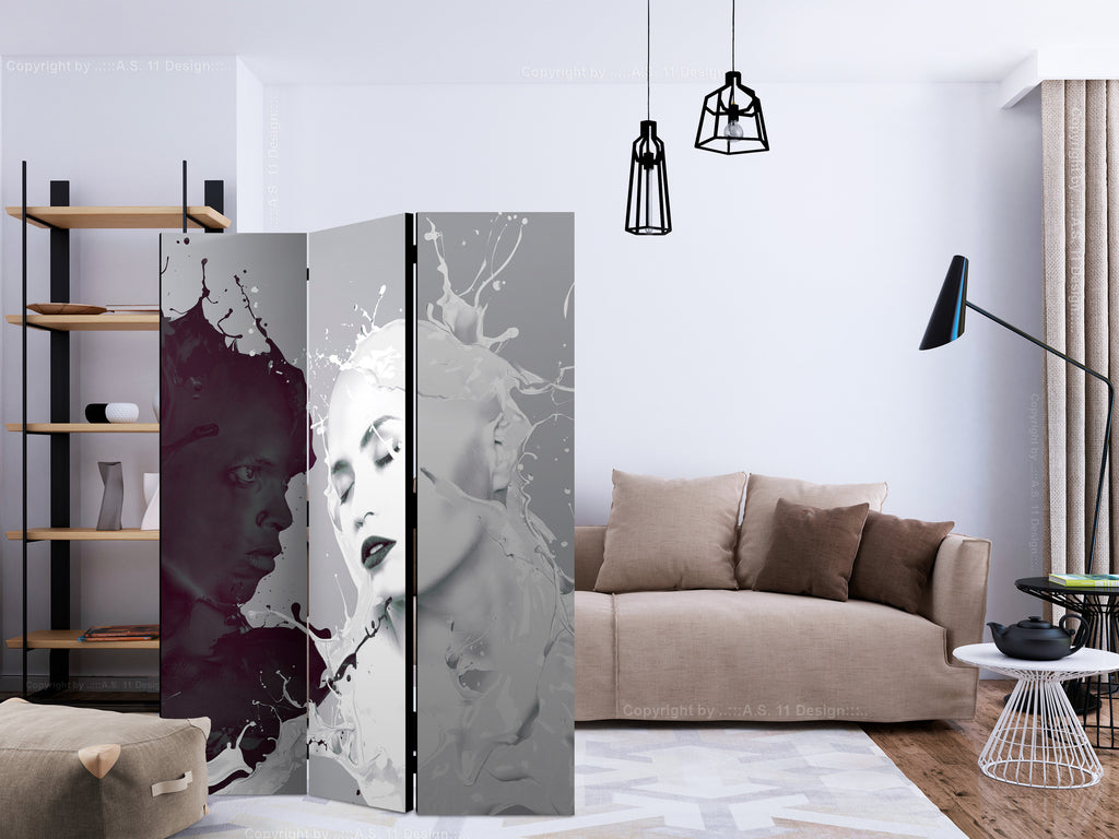 Het decoratieve vouwscherm "Vouwscherm - Dissonance [Room Dividers]" past uitzonderlijk mooi in een modern interieur. Het houten driedelige en tweezijdig bedrukte vouwscherm geeft niet alleen een mooie opdeling van een ruimte maar geeft ook een fantastische flair aan uw interieur. De perfectie uitvoering en het originele motief in full HD uitvoering zorgen ervoor dat de kamervouwschermen iedere ruimte een originele charme verschaffen. Een prachtig kamervouwscherm is een zeer originele versiering en kan bijvoorbeeld prima worden toegepast in woningen of dienstruimten. (kapsalon, dokterskliniek, administratiekantoor etc)