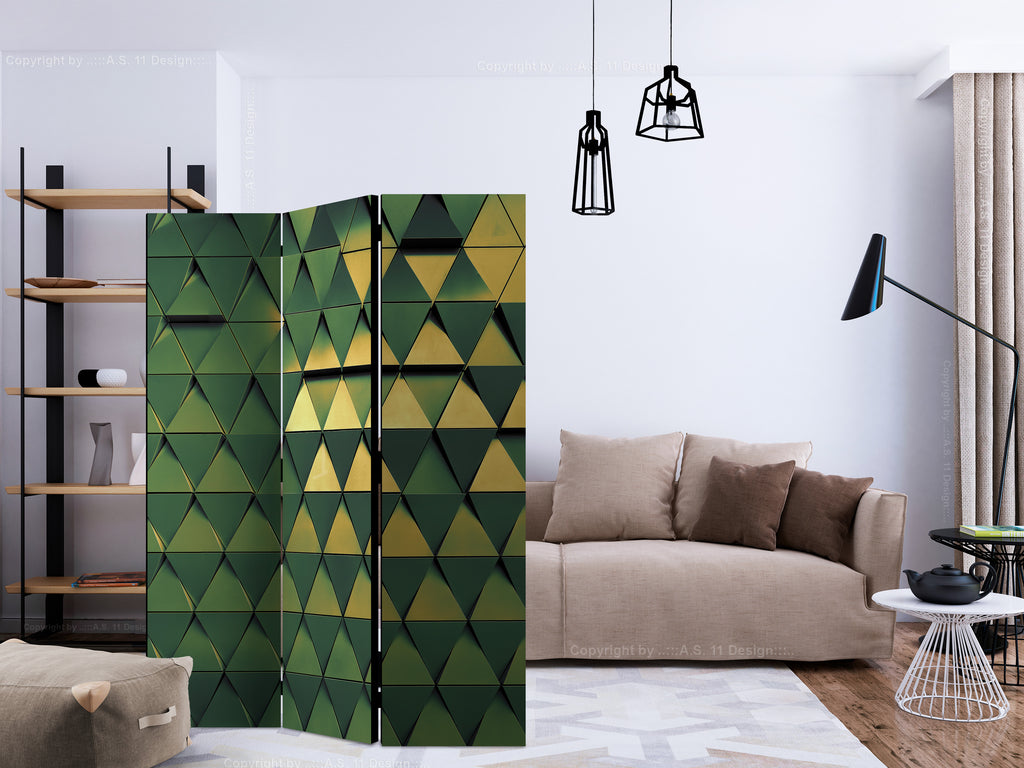 Het decoratieve vouwscherm "Vouwscherm - Dragon Scales [Room Dividers]" past uitzonderlijk mooi in een modern interieur. Het houten driedelige en tweezijdig bedrukte vouwscherm geeft niet alleen een mooie opdeling van een ruimte maar geeft ook een fantastische flair aan uw interieur. De perfectie uitvoering en het originele motief in full HD uitvoering zorgen ervoor dat de kamervouwschermen iedere ruimte een originele charme verschaffen. Een prachtig kamervouwscherm is een zeer originele versiering en kan bijvoorbeeld prima worden toegepast in woningen of dienstruimten. (kapsalon, dokterskliniek, administratiekantoor etc)