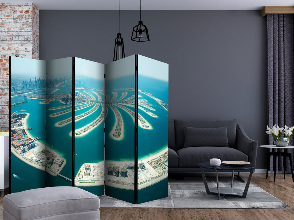 Het decoratieve vouwscherm "Vouwscherm - Dubai: Palm Island II [Room Dividers]" past uitzonderlijk mooi in een modern interieur. Het houten tweezijdig bedrukte vouwscherm geeft niet alleen een mooie opdeling van een ruimte maar geeft ook een fantastische flair aan uw interieur. De perfectie uitvoering en het originele motief in full HD uitvoering zorgen ervoor dat de kamervouwschermen iedere ruimte een originele charme verschaffen. Een prachtig kamervouwscherm is een zeer originele versiering en kan bijvoorbeeld prima worden toegepast in woningen of dienstruimten. (kapsalon, dokterskliniek, administratiekantoor etc)