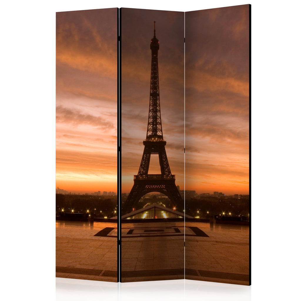 Het decoratieve vouwscherm "Vouwscherm - Eiffel tower at dawn [Room Dividers]" past uitzonderlijk mooi in een modern interieur. Het houten driedelige en tweezijdig bedrukte vouwscherm geeft niet alleen een mooie opdeling van een ruimte maar geeft ook een fantastische flair aan uw interieur. De perfectie uitvoering en het originele motief in full HD uitvoering zorgen ervoor dat de kamervouwschermen iedere ruimte een originele charme verschaffen. Een prachtig kamervouwscherm is een zeer originele versiering en kan bijvoorbeeld prima worden toegepast in woningen of dienstruimten. (kapsalon, dokterskliniek, administratiekantoor etc)