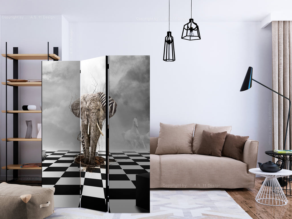 Het decoratieve vouwscherm "Vouwscherm - Escape from Africa [Room Dividers]" past uitzonderlijk mooi in een modern interieur. Het houten driedelige en tweezijdig bedrukte vouwscherm geeft niet alleen een mooie opdeling van een ruimte maar geeft ook een fantastische flair aan uw interieur. De perfectie uitvoering en het originele motief in full HD uitvoering zorgen ervoor dat de kamervouwschermen iedere ruimte een originele charme verschaffen. Een prachtig kamervouwscherm is een zeer originele versiering en kan bijvoorbeeld prima worden toegepast in woningen of dienstruimten. (kapsalon, dokterskliniek, administratiekantoor etc)
