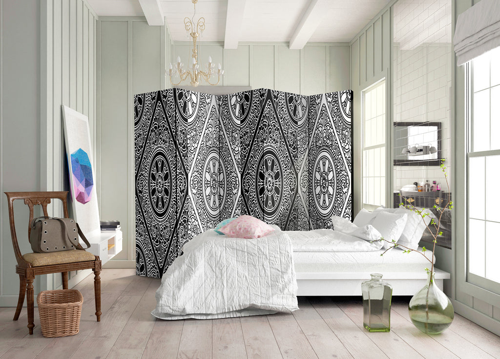 Het decoratieve vouwscherm "Vouwscherm - Ethnic Monochrome II [Room Dividers]" past uitzonderlijk mooi in een modern interieur. Het houten tweezijdig bedrukte vouwscherm geeft niet alleen een mooie opdeling van een ruimte maar geeft ook een fantastische flair aan uw interieur. De perfectie uitvoering en het originele motief in full HD uitvoering zorgen ervoor dat de kamervouwschermen iedere ruimte een originele charme verschaffen. Een prachtig kamervouwscherm is een zeer originele versiering en kan bijvoorbeeld prima worden toegepast in woningen of dienstruimten. (kapsalon, dokterskliniek, administratiekantoor etc)