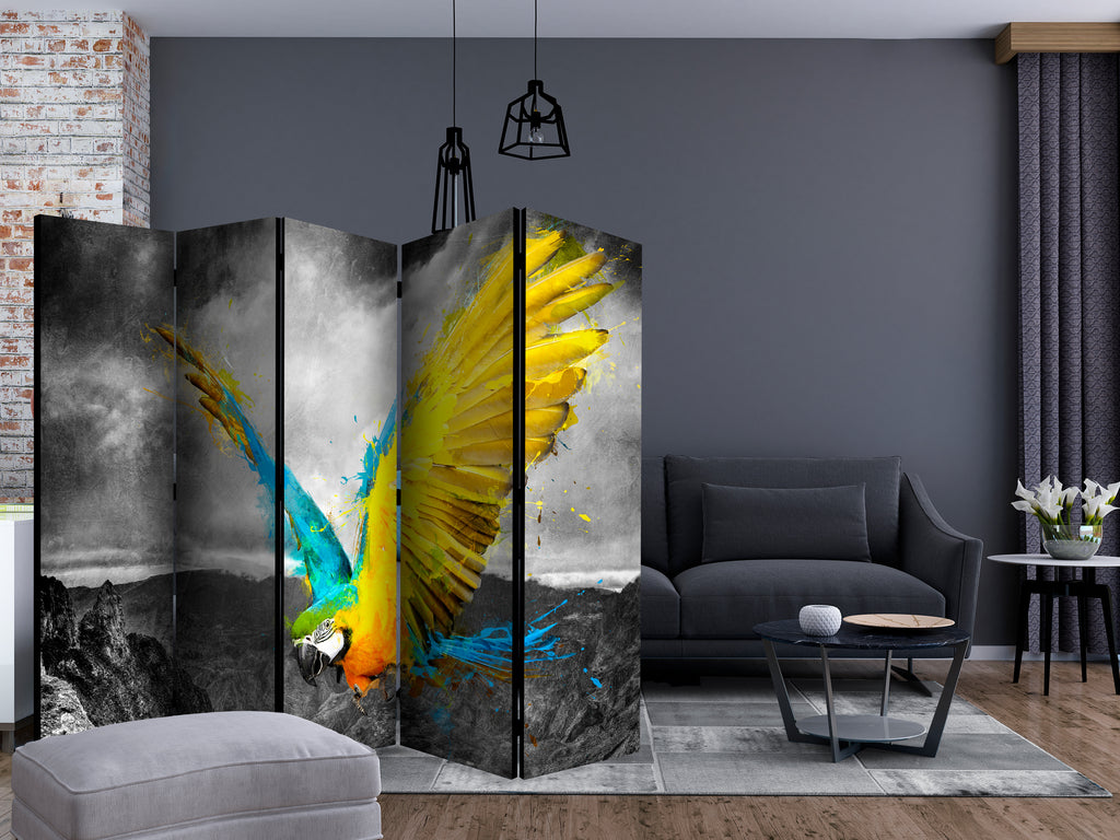 Het decoratieve vouwscherm "Vouwscherm - Exotic parrot II [Room Dividers]" past uitzonderlijk mooi in een modern interieur. Het houten tweezijdig bedrukte vouwscherm geeft niet alleen een mooie opdeling van een ruimte maar geeft ook een fantastische flair aan uw interieur. De perfectie uitvoering en het originele motief in full HD uitvoering zorgen ervoor dat de kamervouwschermen iedere ruimte een originele charme verschaffen. Een prachtig kamervouwscherm is een zeer originele versiering en kan bijvoorbeeld prima worden toegepast in woningen of dienstruimten. (kapsalon, dokterskliniek, administratiekantoor etc)