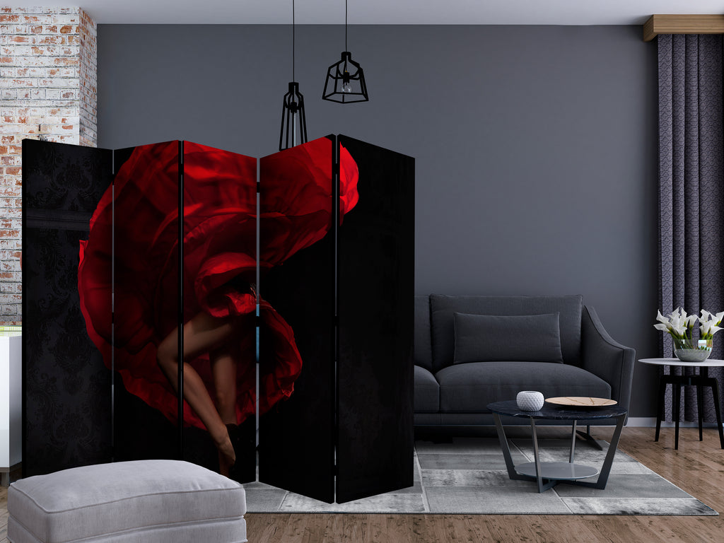 Het decoratieve vouwscherm "Vouwscherm - Flamenco dancer II [Room Dividers]" past uitzonderlijk mooi in een modern interieur. Het houten tweezijdig bedrukte vouwscherm geeft niet alleen een mooie opdeling van een ruimte maar geeft ook een fantastische flair aan uw interieur. De perfectie uitvoering en het originele motief in full HD uitvoering zorgen ervoor dat de kamervouwschermen iedere ruimte een originele charme verschaffen. Een prachtig kamervouwscherm is een zeer originele versiering en kan bijvoorbeeld prima worden toegepast in woningen of dienstruimten. (kapsalon, dokterskliniek, administratiekantoor etc)