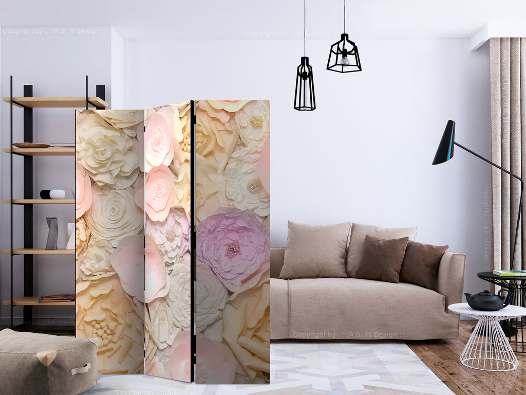 Het decoratieve vouwscherm "Vouwscherm - Flower Bouquet [Room Dividers]" past uitzonderlijk mooi in een modern interieur. Het houten driedelige en tweezijdig bedrukte vouwscherm geeft niet alleen een mooie opdeling van een ruimte maar geeft ook een fantastische flair aan uw interieur. De perfectie uitvoering en het originele motief in full HD uitvoering zorgen ervoor dat de kamervouwschermen iedere ruimte een originele charme verschaffen. Een prachtig kamervouwscherm is een zeer originele versiering en kan bijvoorbeeld prima worden toegepast in woningen of dienstruimten. (kapsalon, dokterskliniek, administratiekantoor etc)