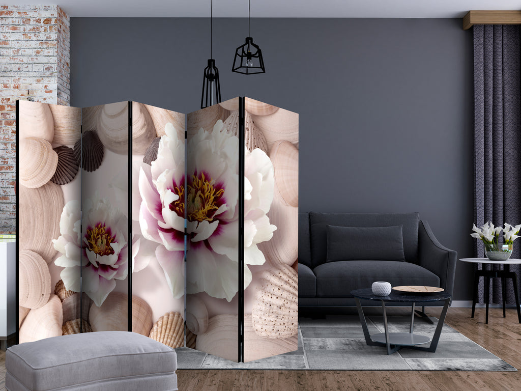 Het decoratieve vouwscherm "Vouwscherm - Flowers and Shells II [Room Dividers]" past uitzonderlijk mooi in een modern interieur. Het houten tweezijdig bedrukte vouwscherm geeft niet alleen een mooie opdeling van een ruimte maar geeft ook een fantastische flair aan uw interieur. De perfectie uitvoering en het originele motief in full HD uitvoering zorgen ervoor dat de kamervouwschermen iedere ruimte een originele charme verschaffen. Een prachtig kamervouwscherm is een zeer originele versiering en kan bijvoorbeeld prima worden toegepast in woningen of dienstruimten. (kapsalon, dokterskliniek, administratiekantoor etc)