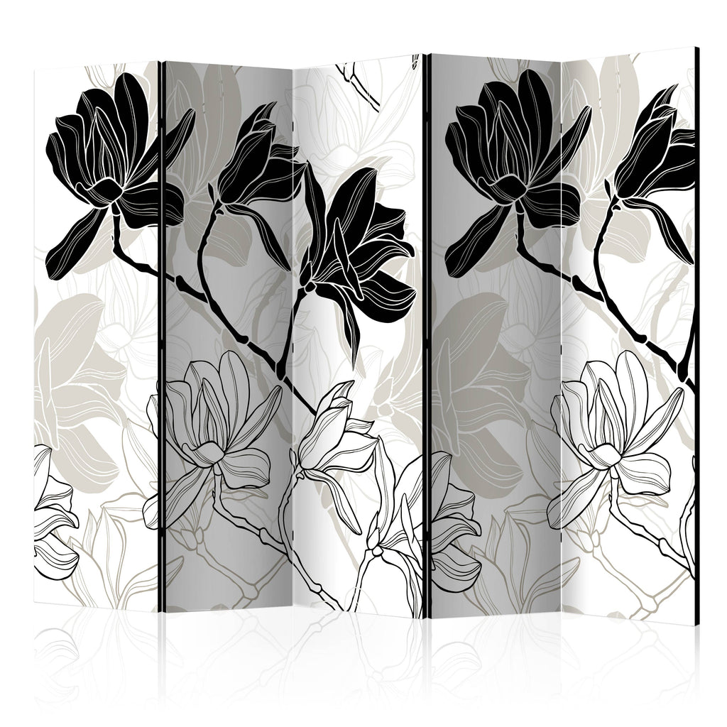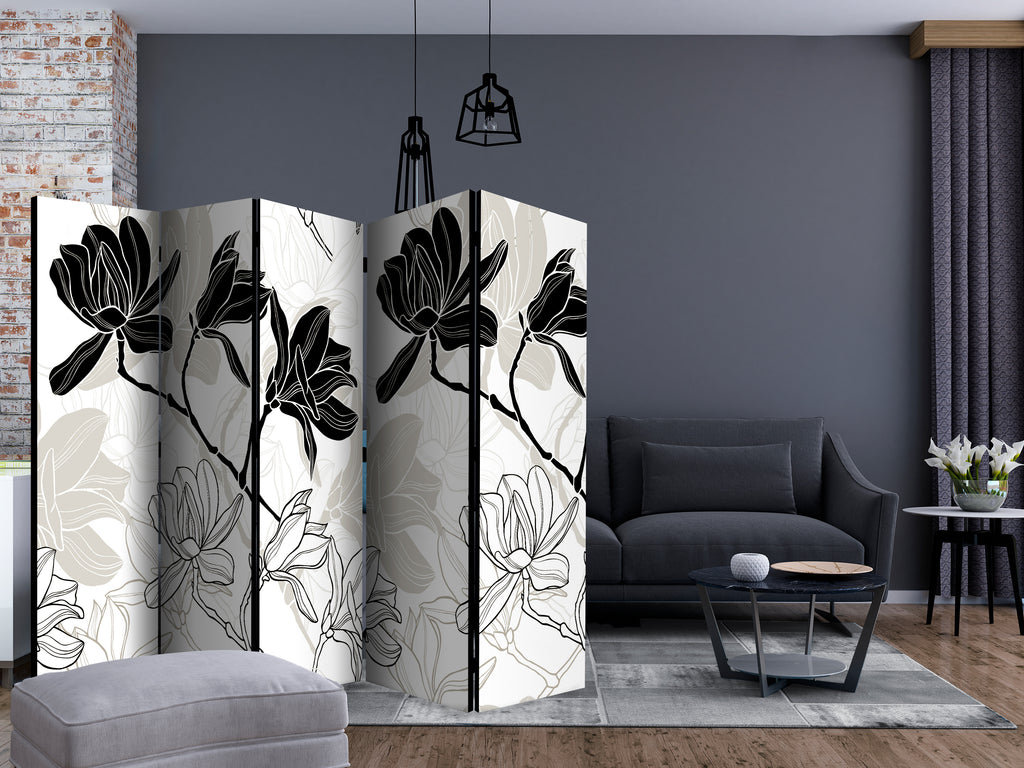 Het decoratieve vouwscherm "Vouwscherm - Flowers B&W II [Room Dividers]" past uitzonderlijk mooi in een modern interieur. Het houten tweezijdig bedrukte vouwscherm geeft niet alleen een mooie opdeling van een ruimte maar geeft ook een fantastische flair aan uw interieur. De perfectie uitvoering en het originele motief in full HD uitvoering zorgen ervoor dat de kamervouwschermen iedere ruimte een originele charme verschaffen. Een prachtig kamervouwscherm is een zeer originele versiering en kan bijvoorbeeld prima worden toegepast in woningen of dienstruimten. (kapsalon, dokterskliniek, administratiekantoor etc)