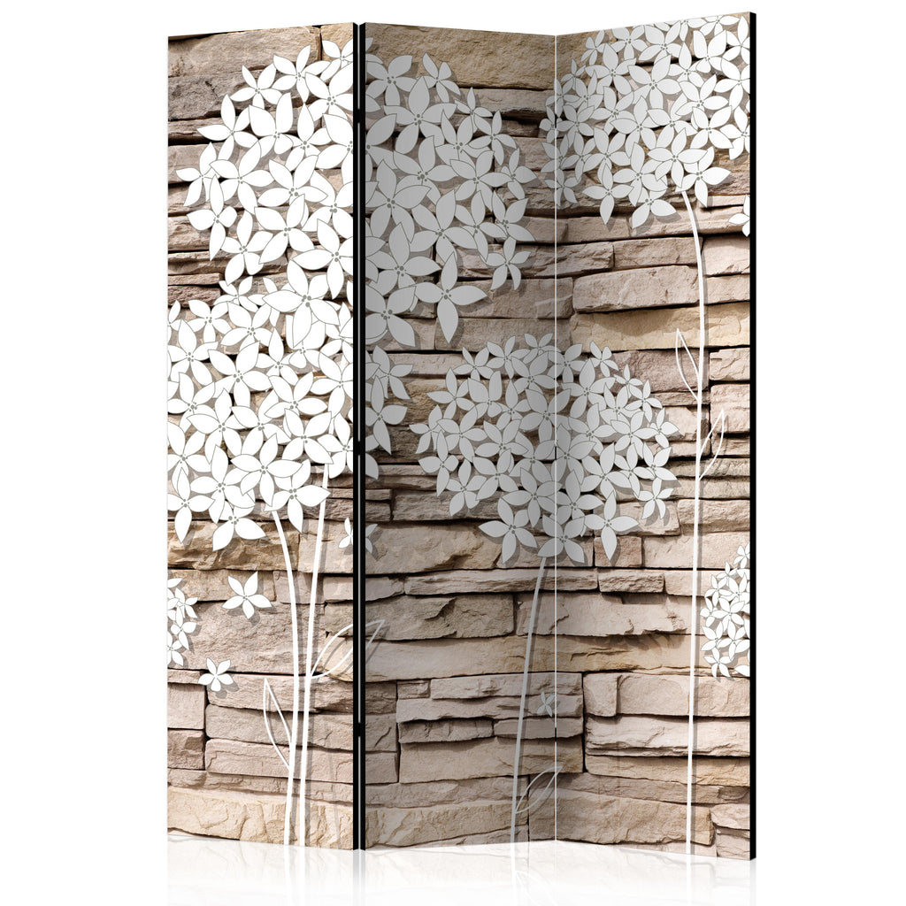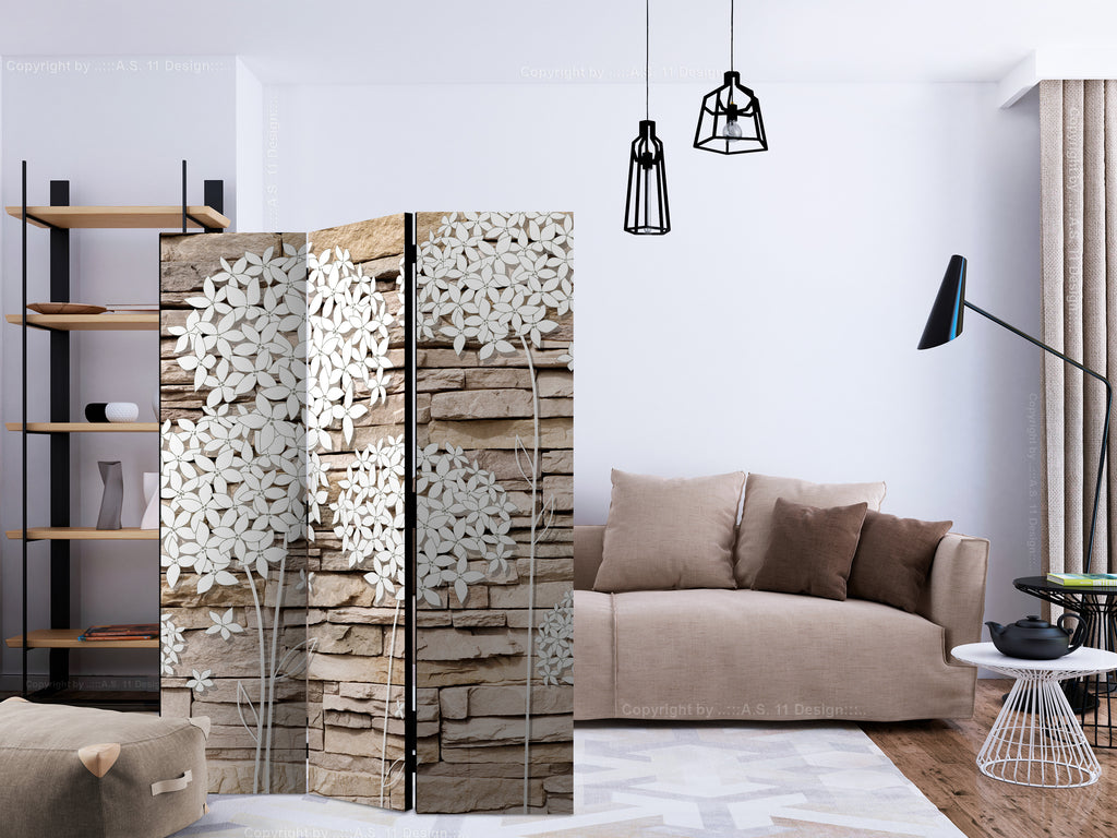 Het decoratieve vouwscherm "Vouwscherm - Flowers on the Stone [Room Dividers]" past uitzonderlijk mooi in een modern interieur. Het houten driedelige en tweezijdig bedrukte vouwscherm geeft niet alleen een mooie opdeling van een ruimte maar geeft ook een fantastische flair aan uw interieur. De perfectie uitvoering en het originele motief in full HD uitvoering zorgen ervoor dat de kamervouwschermen iedere ruimte een originele charme verschaffen. Een prachtig kamervouwscherm is een zeer originele versiering en kan bijvoorbeeld prima worden toegepast in woningen of dienstruimten. (kapsalon, dokterskliniek, administratiekantoor etc)