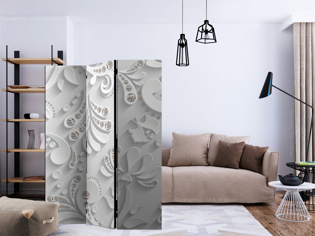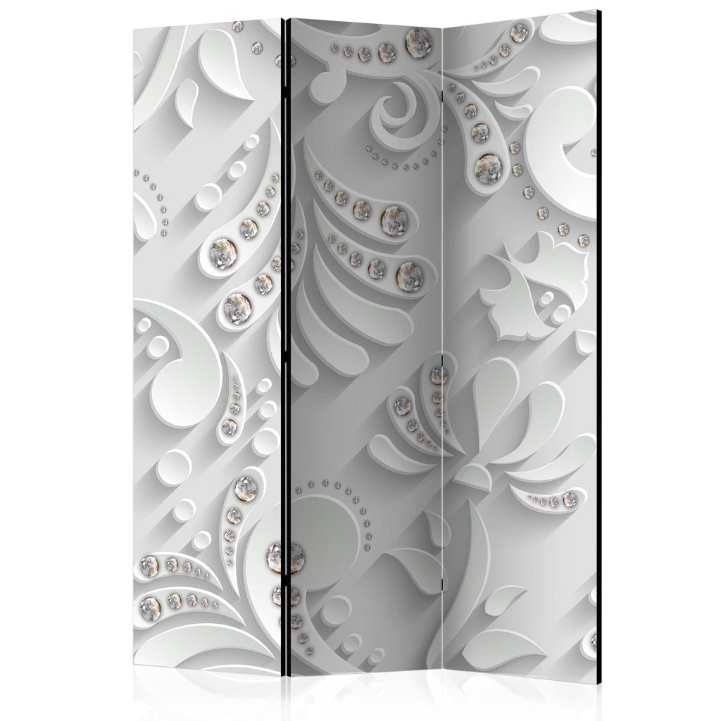 Het decoratieve vouwscherm "Vouwscherm - Flowers with Crystals [Room Dividers]" past uitzonderlijk mooi in een modern interieur. Het houten driedelige en tweezijdig bedrukte vouwscherm geeft niet alleen een mooie opdeling van een ruimte maar geeft ook een fantastische flair aan uw interieur. De perfectie uitvoering en het originele motief in full HD uitvoering zorgen ervoor dat de kamervouwschermen iedere ruimte een originele charme verschaffen. Een prachtig kamervouwscherm is een zeer originele versiering en kan bijvoorbeeld prima worden toegepast in woningen of dienstruimten. (kapsalon, dokterskliniek, administratiekantoor etc)