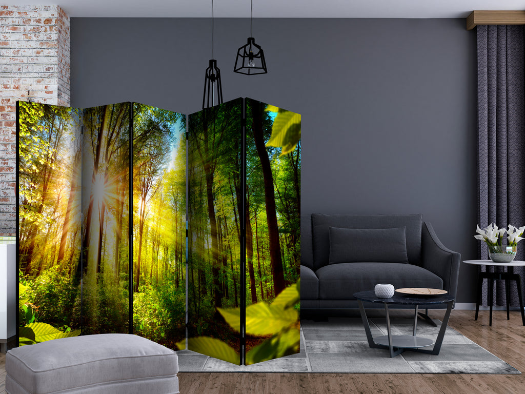 Het decoratieve vouwscherm "Vouwscherm - Forest Hideout II [Room Dividers]" past uitzonderlijk mooi in een modern interieur. Het houten tweezijdig bedrukte vouwscherm geeft niet alleen een mooie opdeling van een ruimte maar geeft ook een fantastische flair aan uw interieur. De perfectie uitvoering en het originele motief in full HD uitvoering zorgen ervoor dat de kamervouwschermen iedere ruimte een originele charme verschaffen. Een prachtig kamervouwscherm is een zeer originele versiering en kan bijvoorbeeld prima worden toegepast in woningen of dienstruimten. (kapsalon, dokterskliniek, administratiekantoor etc)