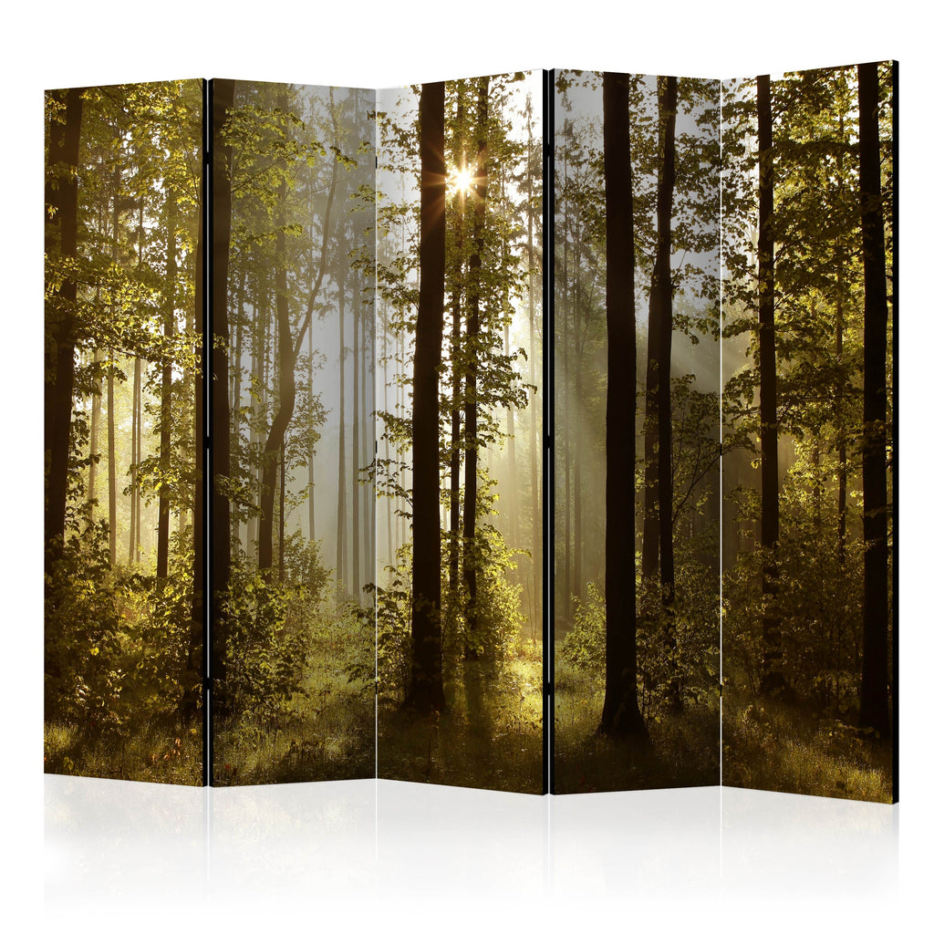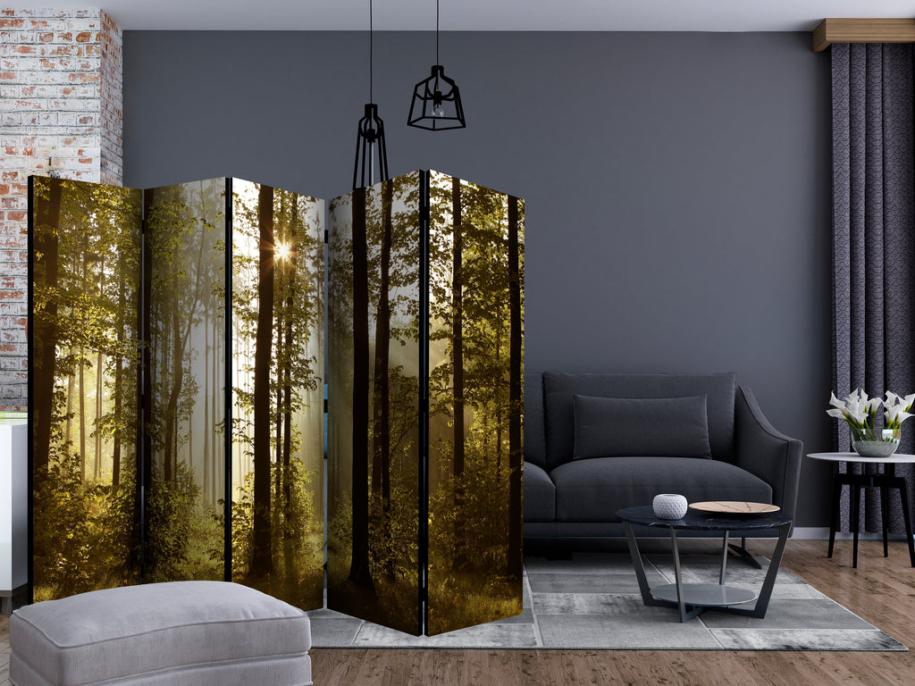 Het decoratieve vouwscherm "Vouwscherm - Forest: Morning Sunlight II [Room Dividers]" past uitzonderlijk mooi in een modern interieur. Het houten tweezijdig bedrukte vouwscherm geeft niet alleen een mooie opdeling van een ruimte maar geeft ook een fantastische flair aan uw interieur. De perfectie uitvoering en het originele motief in full HD uitvoering zorgen ervoor dat de kamervouwschermen iedere ruimte een originele charme verschaffen. Een prachtig kamervouwscherm is een zeer originele versiering en kan bijvoorbeeld prima worden toegepast in woningen of dienstruimten. (kapsalon, dokterskliniek, administratiekantoor etc)