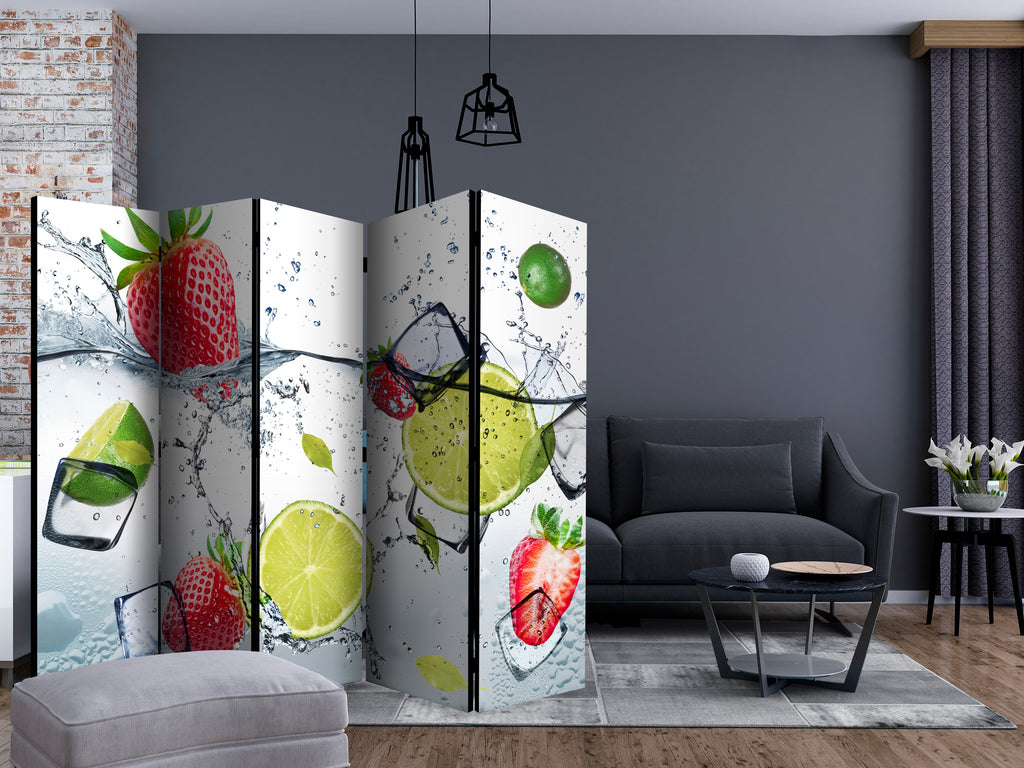 Het decoratieve vouwscherm "Vouwscherm - Fruit cocktail II [Room Dividers]" past uitzonderlijk mooi in een modern interieur. Het houten tweezijdig bedrukte vouwscherm geeft niet alleen een mooie opdeling van een ruimte maar geeft ook een fantastische flair aan uw interieur. De perfectie uitvoering en het originele motief in full HD uitvoering zorgen ervoor dat de kamervouwschermen iedere ruimte een originele charme verschaffen. Een prachtig kamervouwscherm is een zeer originele versiering en kan bijvoorbeeld prima worden toegepast in woningen of dienstruimten. (kapsalon, dokterskliniek, administratiekantoor etc)