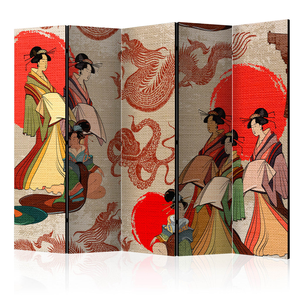 Het decoratieve vouwscherm "Vouwscherm - Geishas II [Room Dividers]" past uitzonderlijk mooi in een modern interieur. Het houten tweezijdig bedrukte vouwscherm geeft niet alleen een mooie opdeling van een ruimte maar geeft ook een fantastische flair aan uw interieur. De perfectie uitvoering en het originele motief in full HD uitvoering zorgen ervoor dat de kamervouwschermen iedere ruimte een originele charme verschaffen. Een prachtig kamervouwscherm is een zeer originele versiering en kan bijvoorbeeld prima worden toegepast in woningen of dienstruimten. (kapsalon, dokterskliniek, administratiekantoor etc)