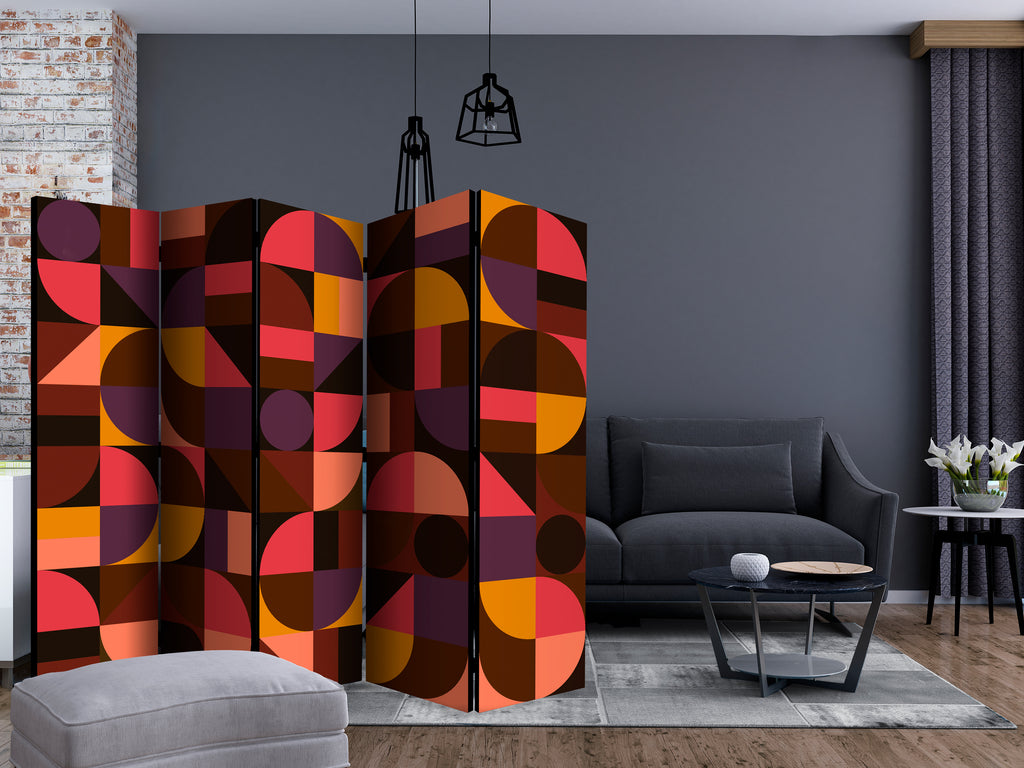 Het decoratieve vouwscherm "Vouwscherm - Geometric Mosaic (Red) II [Room Dividers]" past uitzonderlijk mooi in een modern interieur. Het houten tweezijdig bedrukte vouwscherm geeft niet alleen een mooie opdeling van een ruimte maar geeft ook een fantastische flair aan uw interieur. De perfectie uitvoering en het originele motief in full HD uitvoering zorgen ervoor dat de kamervouwschermen iedere ruimte een originele charme verschaffen. Een prachtig kamervouwscherm is een zeer originele versiering en kan bijvoorbeeld prima worden toegepast in woningen of dienstruimten. (kapsalon, dokterskliniek, administratiekantoor etc)