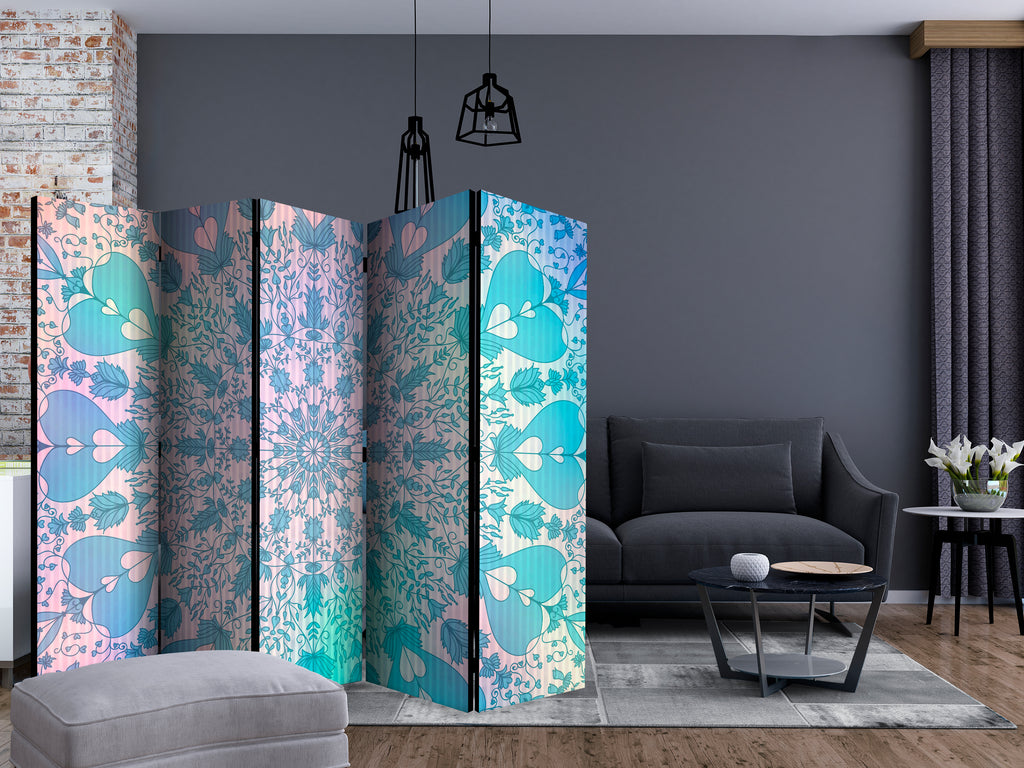 Het decoratieve vouwscherm "Vouwscherm - Girly Mandala (Blue) II [Room Dividers]" past uitzonderlijk mooi in een modern interieur. Het houten tweezijdig bedrukte vouwscherm geeft niet alleen een mooie opdeling van een ruimte maar geeft ook een fantastische flair aan uw interieur. De perfectie uitvoering en het originele motief in full HD uitvoering zorgen ervoor dat de kamervouwschermen iedere ruimte een originele charme verschaffen. Een prachtig kamervouwscherm is een zeer originele versiering en kan bijvoorbeeld prima worden toegepast in woningen of dienstruimten. (kapsalon, dokterskliniek, administratiekantoor etc)