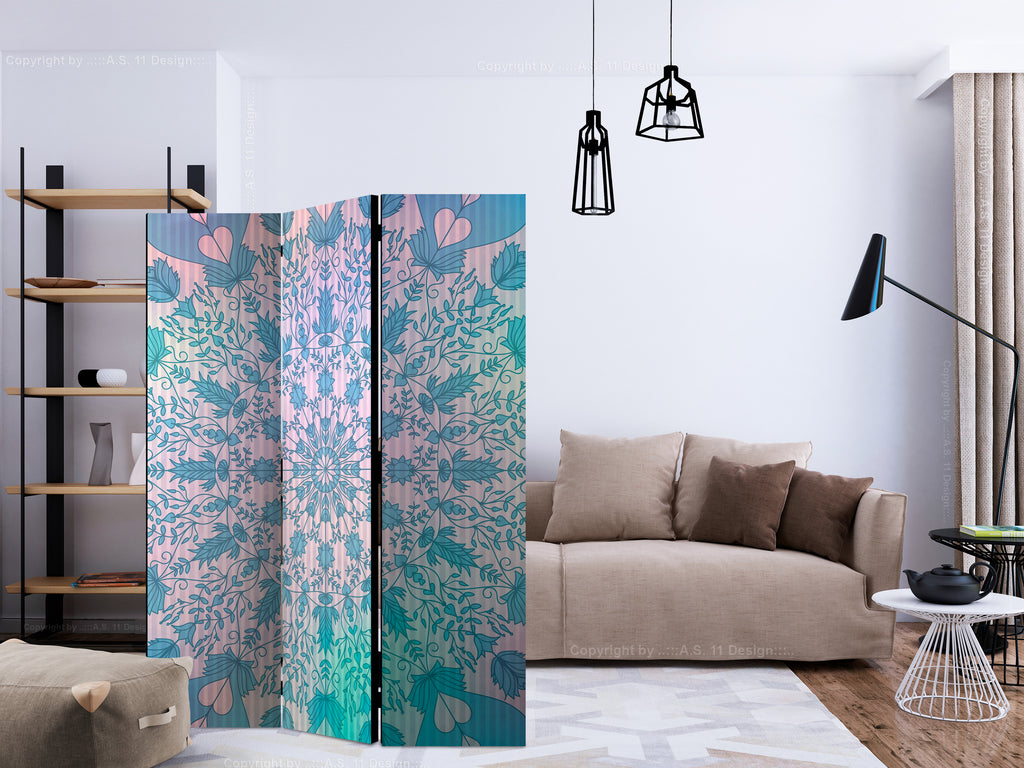 Het decoratieve vouwscherm "Vouwscherm - Girly Mandala (Blue) [Room Dividers]" past uitzonderlijk mooi in een modern interieur. Het houten driedelige en tweezijdig bedrukte vouwscherm geeft niet alleen een mooie opdeling van een ruimte maar geeft ook een fantastische flair aan uw interieur. De perfectie uitvoering en het originele motief in full HD uitvoering zorgen ervoor dat de kamervouwschermen iedere ruimte een originele charme verschaffen. Een prachtig kamervouwscherm is een zeer originele versiering en kan bijvoorbeeld prima worden toegepast in woningen of dienstruimten. (kapsalon, dokterskliniek, administratiekantoor etc)