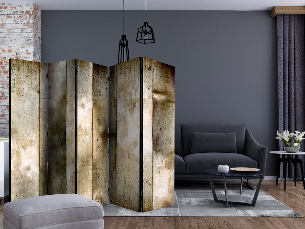 Het decoratieve vouwscherm "Vouwscherm - Gold stripes II [Room Dividers]" past uitzonderlijk mooi in een modern interieur. Het houten tweezijdig bedrukte vouwscherm geeft niet alleen een mooie opdeling van een ruimte maar geeft ook een fantastische flair aan uw interieur. De perfectie uitvoering en het originele motief in full HD uitvoering zorgen ervoor dat de kamervouwschermen iedere ruimte een originele charme verschaffen. Een prachtig kamervouwscherm is een zeer originele versiering en kan bijvoorbeeld prima worden toegepast in woningen of dienstruimten. (kapsalon, dokterskliniek, administratiekantoor etc)