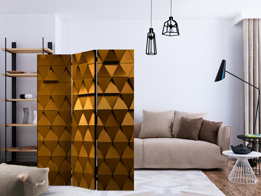 Het decoratieve vouwscherm "Vouwscherm - Golden Armour [Room Dividers]" past uitzonderlijk mooi in een modern interieur. Het houten driedelige en tweezijdig bedrukte vouwscherm geeft niet alleen een mooie opdeling van een ruimte maar geeft ook een fantastische flair aan uw interieur. De perfectie uitvoering en het originele motief in full HD uitvoering zorgen ervoor dat de kamervouwschermen iedere ruimte een originele charme verschaffen. Een prachtig kamervouwscherm is een zeer originele versiering en kan bijvoorbeeld prima worden toegepast in woningen of dienstruimten. (kapsalon, dokterskliniek, administratiekantoor etc)