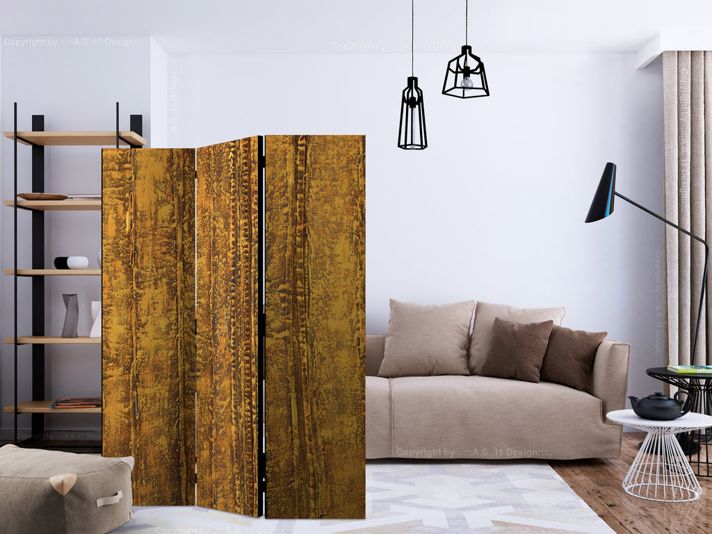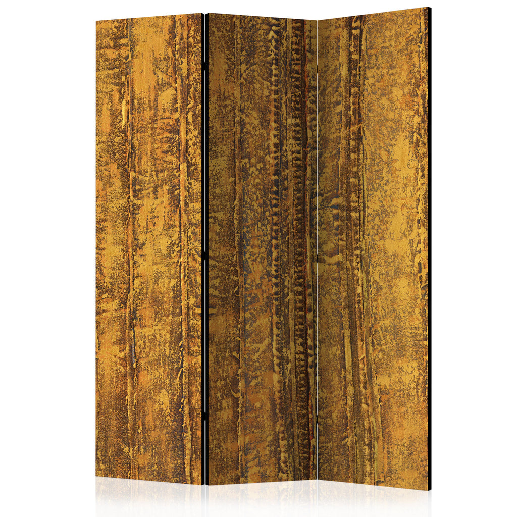 Het decoratieve vouwscherm "Vouwscherm - Golden Chamber [Room Dividers]" past uitzonderlijk mooi in een modern interieur. Het houten driedelige en tweezijdig bedrukte vouwscherm geeft niet alleen een mooie opdeling van een ruimte maar geeft ook een fantastische flair aan uw interieur. De perfectie uitvoering en het originele motief in full HD uitvoering zorgen ervoor dat de kamervouwschermen iedere ruimte een originele charme verschaffen. Een prachtig kamervouwscherm is een zeer originele versiering en kan bijvoorbeeld prima worden toegepast in woningen of dienstruimten. (kapsalon, dokterskliniek, administratiekantoor etc)