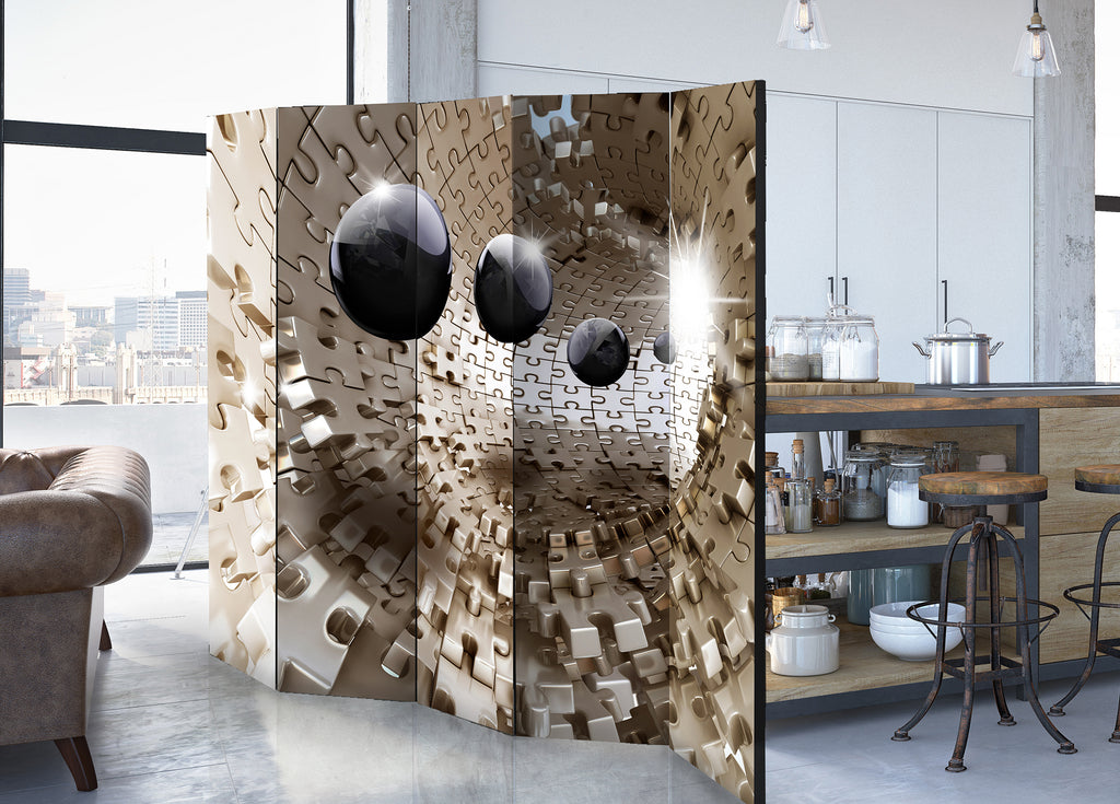 Het decoratieve vouwscherm "Vouwscherm - Golden Jigsaw II [Room Dividers]" past uitzonderlijk mooi in een modern interieur. Het houten tweezijdig bedrukte vouwscherm geeft niet alleen een mooie opdeling van een ruimte maar geeft ook een fantastische flair aan uw interieur. De perfectie uitvoering en het originele motief in full HD uitvoering zorgen ervoor dat de kamervouwschermen iedere ruimte een originele charme verschaffen. Een prachtig kamervouwscherm is een zeer originele versiering en kan bijvoorbeeld prima worden toegepast in woningen of dienstruimten. (kapsalon, dokterskliniek, administratiekantoor etc)
