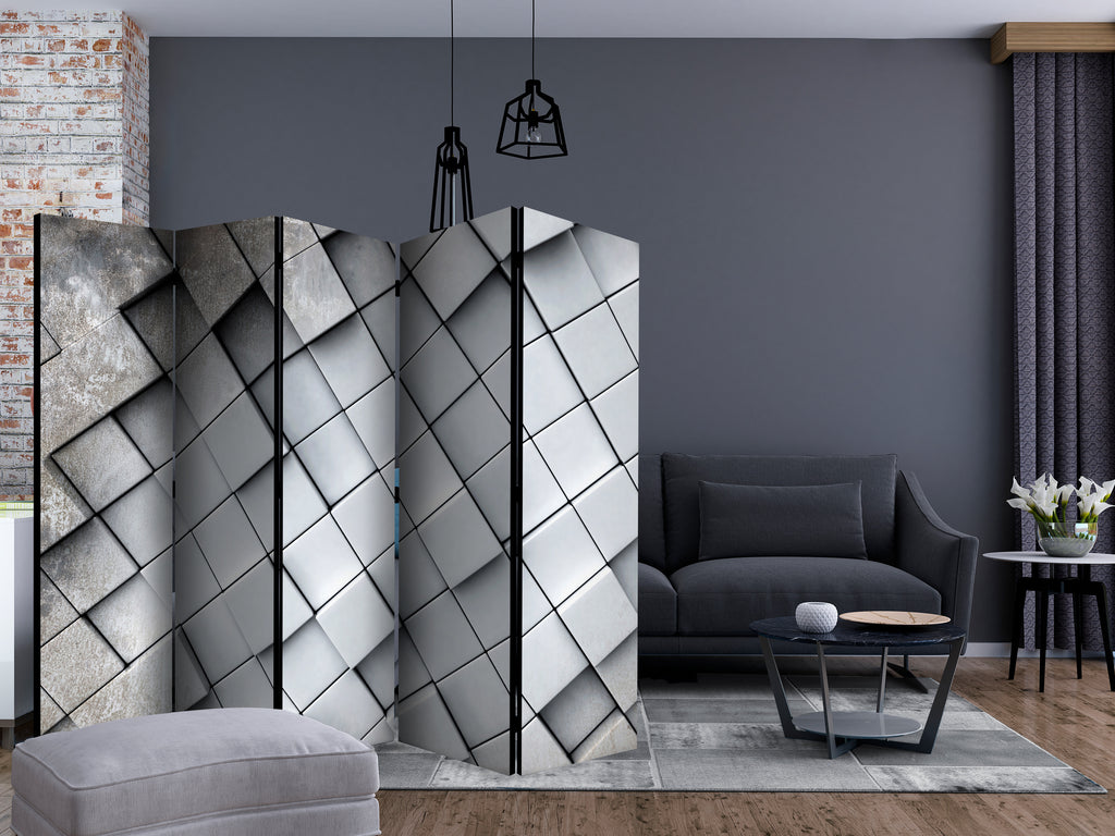 Het decoratieve vouwscherm "Vouwscherm - Gray background 3D II [Room Dividers]" past uitzonderlijk mooi in een modern interieur. Het houten tweezijdig bedrukte vouwscherm geeft niet alleen een mooie opdeling van een ruimte maar geeft ook een fantastische flair aan uw interieur. De perfectie uitvoering en het originele motief in full HD uitvoering zorgen ervoor dat de kamervouwschermen iedere ruimte een originele charme verschaffen. Een prachtig kamervouwscherm is een zeer originele versiering en kan bijvoorbeeld prima worden toegepast in woningen of dienstruimten. (kapsalon, dokterskliniek, administratiekantoor etc)