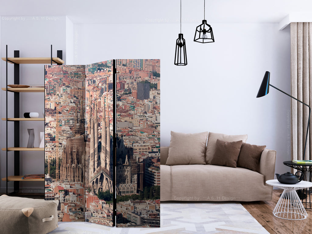 Het decoratieve vouwscherm "Vouwscherm - Heart of Barcelona [Room Dividers]" past uitzonderlijk mooi in een modern interieur. Het houten driedelige en tweezijdig bedrukte vouwscherm geeft niet alleen een mooie opdeling van een ruimte maar geeft ook een fantastische flair aan uw interieur. De perfectie uitvoering en het originele motief in full HD uitvoering zorgen ervoor dat de kamervouwschermen iedere ruimte een originele charme verschaffen. Een prachtig kamervouwscherm is een zeer originele versiering en kan bijvoorbeeld prima worden toegepast in woningen of dienstruimten. (kapsalon, dokterskliniek, administratiekantoor etc)