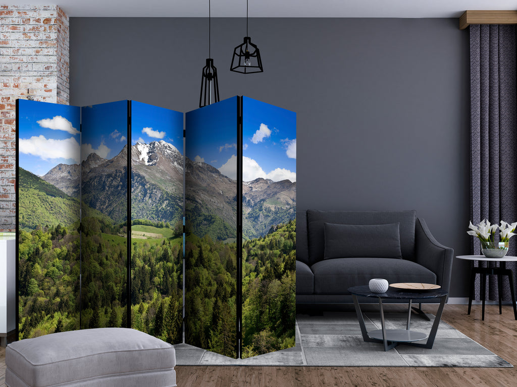 Het decoratieve vouwscherm "Vouwscherm - Holiday in the mountains II [Room Dividers]" past uitzonderlijk mooi in een modern interieur. Het houten tweezijdig bedrukte vouwscherm geeft niet alleen een mooie opdeling van een ruimte maar geeft ook een fantastische flair aan uw interieur. De perfectie uitvoering en het originele motief in full HD uitvoering zorgen ervoor dat de kamervouwschermen iedere ruimte een originele charme verschaffen. Een prachtig kamervouwscherm is een zeer originele versiering en kan bijvoorbeeld prima worden toegepast in woningen of dienstruimten. (kapsalon, dokterskliniek, administratiekantoor etc)