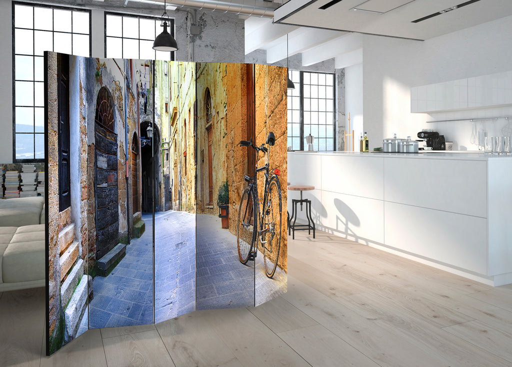 Het decoratieve vouwscherm "Vouwscherm - Italy Holidays II [Room Dividers]" past uitzonderlijk mooi in een modern interieur. Het houten tweezijdig bedrukte vouwscherm geeft niet alleen een mooie opdeling van een ruimte maar geeft ook een fantastische flair aan uw interieur. De perfectie uitvoering en het originele motief in full HD uitvoering zorgen ervoor dat de kamervouwschermen iedere ruimte een originele charme verschaffen. Een prachtig kamervouwscherm is een zeer originele versiering en kan bijvoorbeeld prima worden toegepast in woningen of dienstruimten. (kapsalon, dokterskliniek, administratiekantoor etc)