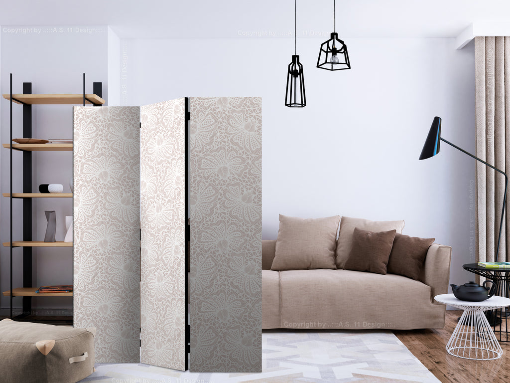 Het decoratieve vouwscherm "Vouwscherm - Knitted Ornaments [Room Dividers]" past uitzonderlijk mooi in een modern interieur. Het houten driedelige en tweezijdig bedrukte vouwscherm geeft niet alleen een mooie opdeling van een ruimte maar geeft ook een fantastische flair aan uw interieur. De perfectie uitvoering en het originele motief in full HD uitvoering zorgen ervoor dat de kamervouwschermen iedere ruimte een originele charme verschaffen. Een prachtig kamervouwscherm is een zeer originele versiering en kan bijvoorbeeld prima worden toegepast in woningen of dienstruimten. (kapsalon, dokterskliniek, administratiekantoor etc)