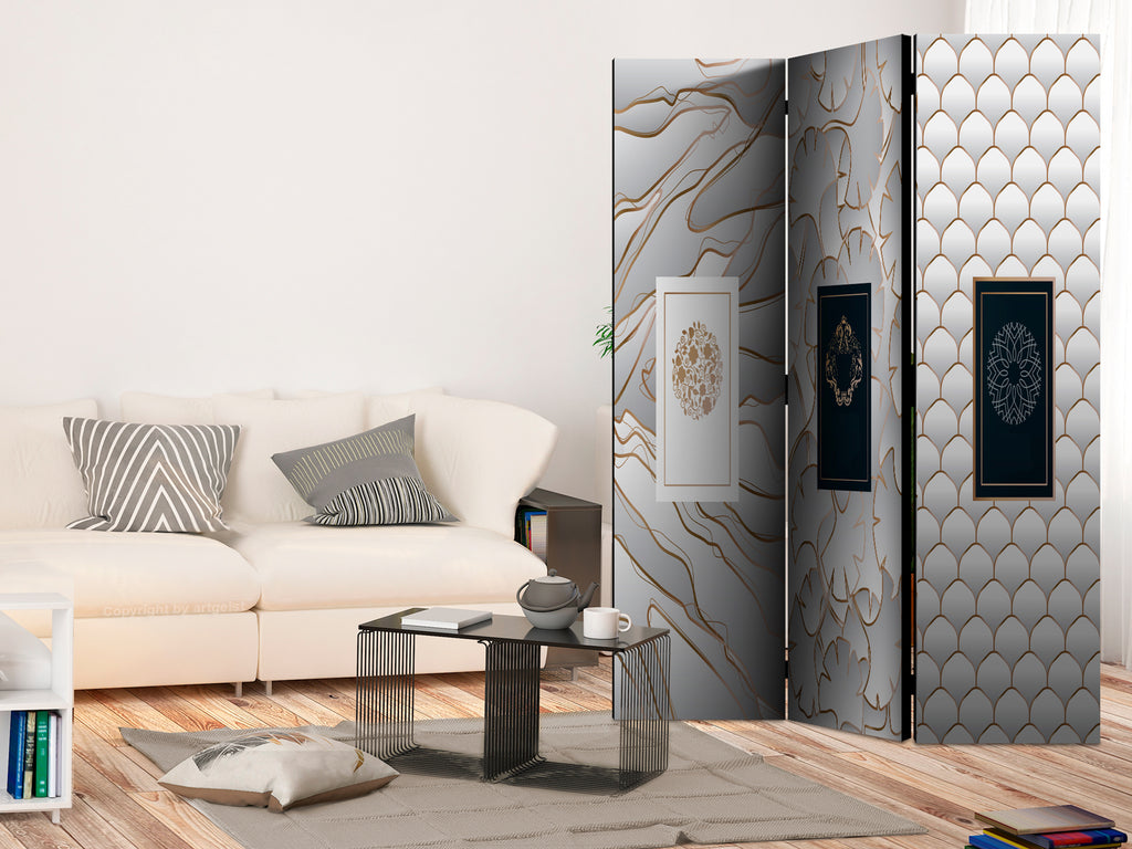 Het decoratieve vouwscherm "Vouwscherm - Labels [Room Dividers]" past uitzonderlijk mooi in een modern interieur. Het houten driedelige en tweezijdig bedrukte vouwscherm geeft niet alleen een mooie opdeling van een ruimte maar geeft ook een fantastische flair aan uw interieur. De perfectie uitvoering en het originele motief in full HD uitvoering zorgen ervoor dat de kamervouwschermen iedere ruimte een originele charme verschaffen. Een prachtig kamervouwscherm is een zeer originele versiering en kan bijvoorbeeld prima worden toegepast in woningen of dienstruimten. (kapsalon, dokterskliniek, administratiekantoor etc)