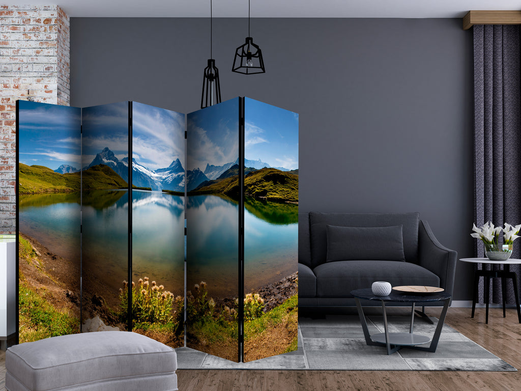 Het decoratieve vouwscherm "Vouwscherm - Lake with mountain reflection, Switzerland II [Room Dividers]" past uitzonderlijk mooi in een modern interieur. Het houten tweezijdig bedrukte vouwscherm geeft niet alleen een mooie opdeling van een ruimte maar geeft ook een fantastische flair aan uw interieur. De perfectie uitvoering en het originele motief in full HD uitvoering zorgen ervoor dat de kamervouwschermen iedere ruimte een originele charme verschaffen. Een prachtig kamervouwscherm is een zeer originele versiering en kan bijvoorbeeld prima worden toegepast in woningen of dienstruimten. (kapsalon, dokterskliniek, administratiekantoor etc)