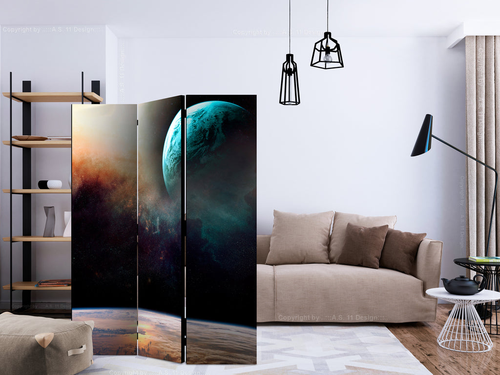 Het decoratieve vouwscherm "Vouwscherm - Like being on another planet [Room Dividers]" past uitzonderlijk mooi in een modern interieur. Het houten driedelige en tweezijdig bedrukte vouwscherm geeft niet alleen een mooie opdeling van een ruimte maar geeft ook een fantastische flair aan uw interieur. De perfectie uitvoering en het originele motief in full HD uitvoering zorgen ervoor dat de kamervouwschermen iedere ruimte een originele charme verschaffen. Een prachtig kamervouwscherm is een zeer originele versiering en kan bijvoorbeeld prima worden toegepast in woningen of dienstruimten. (kapsalon, dokterskliniek, administratiekantoor etc)