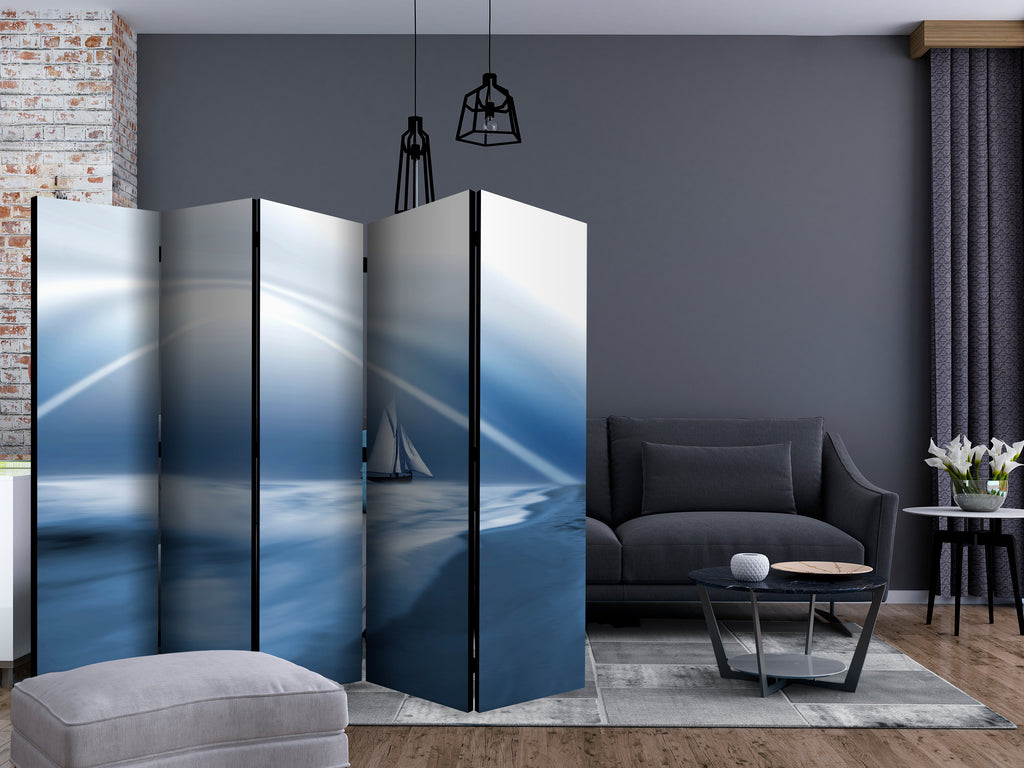 Het decoratieve vouwscherm "Vouwscherm - Lonely sail drifting II [Room Dividers]" past uitzonderlijk mooi in een modern interieur. Het houten tweezijdig bedrukte vouwscherm geeft niet alleen een mooie opdeling van een ruimte maar geeft ook een fantastische flair aan uw interieur. De perfectie uitvoering en het originele motief in full HD uitvoering zorgen ervoor dat de kamervouwschermen iedere ruimte een originele charme verschaffen. Een prachtig kamervouwscherm is een zeer originele versiering en kan bijvoorbeeld prima worden toegepast in woningen of dienstruimten. (kapsalon, dokterskliniek, administratiekantoor etc)