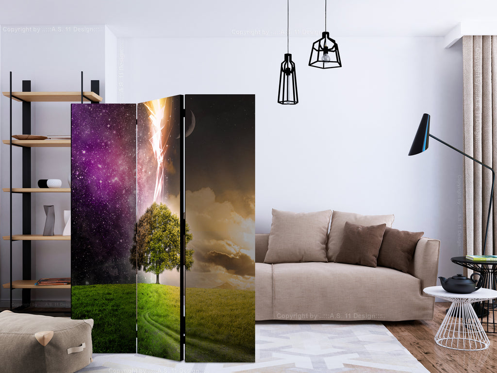 Het decoratieve vouwscherm "Vouwscherm - Magic Tree [Room Dividers]" past uitzonderlijk mooi in een modern interieur. Het houten driedelige en tweezijdig bedrukte vouwscherm geeft niet alleen een mooie opdeling van een ruimte maar geeft ook een fantastische flair aan uw interieur. De perfectie uitvoering en het originele motief in full HD uitvoering zorgen ervoor dat de kamervouwschermen iedere ruimte een originele charme verschaffen. Een prachtig kamervouwscherm is een zeer originele versiering en kan bijvoorbeeld prima worden toegepast in woningen of dienstruimten. (kapsalon, dokterskliniek, administratiekantoor etc)